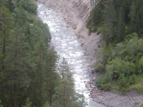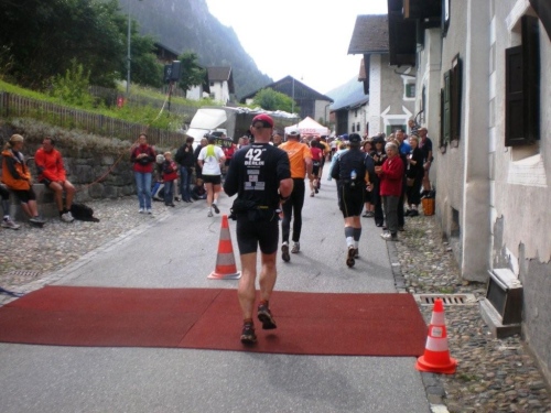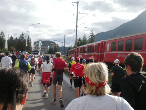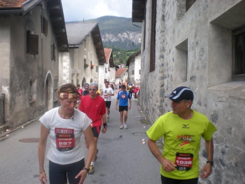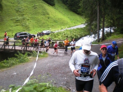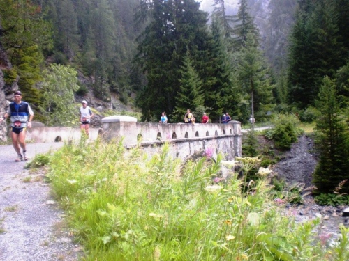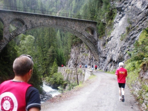 Auf dem Nachfolger dieser Straße rolle ich hinunter zum Talboden. Dieser alt-neue Streckenabschnitt behagt mir besser, er sorgt für mehr Platz für die einzelnen Läufer und gesteht deshalb den Bergabspezialisten mehr Tempo zu. Zufällig beginnt gerade jetzt die Sonne ungehindert zu scheinen, eine Freude, die aber nur von kurzer Dauer ist. Bevor ich unten bei der Bahnlinie ankomme, spüre zuerst ein leichtes Nieseln, dann einige Tropfen und beim Eingang in die Zügenschlucht richtigen Regen. Was erwartet den Teilnehmer auf diesem Teil der Strecke, den wir auf der alten Landwasserstrasse belaufen?