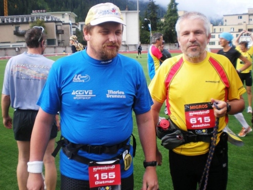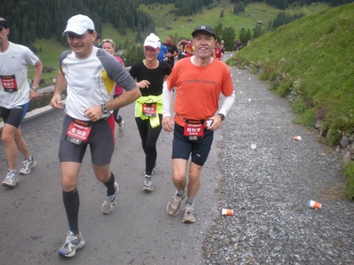 Wegen der zu erwartenden Sonne im Hochgebirge bin ich – vorbildlich - mit Sonnenbrille gestartet; in der Zwischenzeit hat sie mir Reto in Einzelteilen in den Rucksack gepackt. (Gut, wenn man im Läuferfeld immer wieder Bekannte antrifft, welche man zu solchen Helfersdiensten heranziehen kann.) Nimmt mich bloß wunder, wie sich von einem Moment auf den anderen die kleine Schraube aus dem Scharnier verabschieden kann?