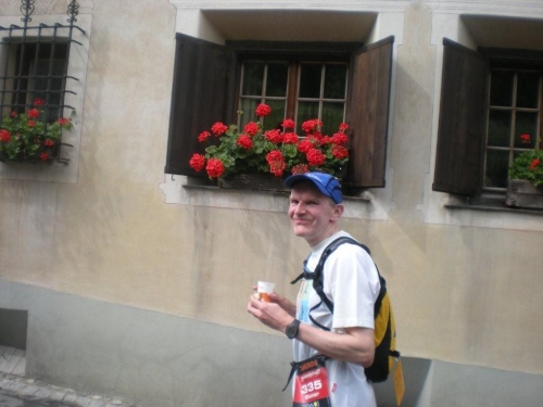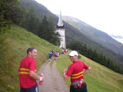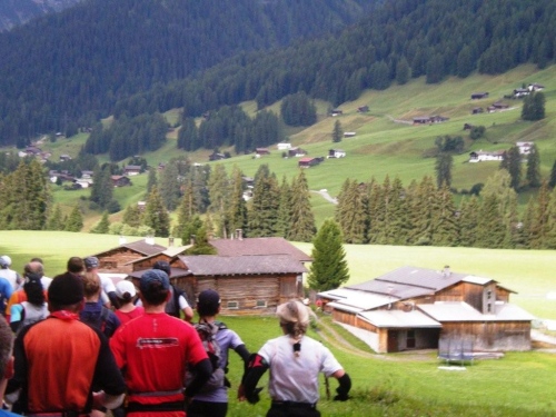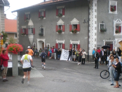 Nach dem schönen Abschnitt durch den Wald kommt wieder die Kirche von Monstein ins Blickfeld, für mich einer der optischen Fixpunkte der Strecke. An der höchstgelegenen Brauerei Europas Brauerei kommen wir in diesem Jahr nicht vorbei. Hier wurde eine Änderung der Strecke vorgenommen, für alte Hasen ein „back to the roots“. Macht nichts, für ein Bier ist es mir noch zu früh und eine andere Spezialität, die in Zusammenarbeit mit der Brauerei auf den Markt gebracht wurde, kann ich später beim Hauptsponsor kaufen: den preisgekrönten (Prix d’Innovation Agricole Suisse 2002) Monsteiner Braukäse, ein Halbhartkäse aus pasteurisierter Milch, der mit Aromahopfen und Biertreber verfeinert wird.