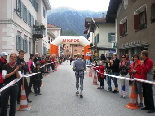 Mit der Zeit habe ich es nicht so im Griff. Sie geht auf dieser schönen, abwechslungsreichen Strecke zwar schnell vorbei, doch ich fühle mich noch recht frisch. Daraus schließe ich, dass ich mich etwa im geplanten Zeitrahmen Filisur nähere. Genau wissen will ich es erst bei Kilometer 30, wo ich mein Gefühl mit der Uhrzeit vergleiche. Mit ein paar Minuten Vorsprung auf meine Marschtabelle überquere ich die Zeitmessmatten im Dorf und bedaure diejenigen, die hier schon den Zieleinlauf haben, dass für sie der Genuss schon zu Ende ist.