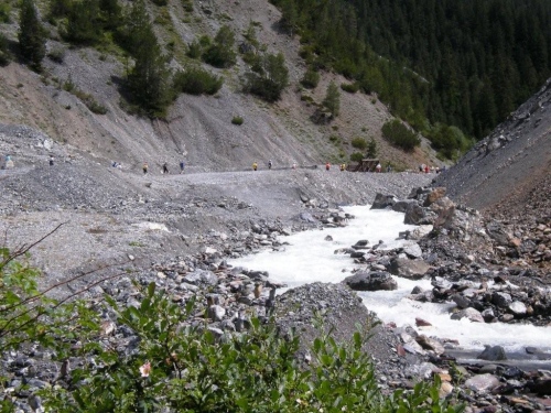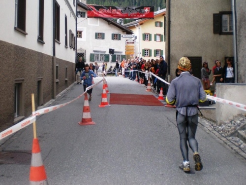 Das Kleiderdepot eingangs Dorf kann ich rechts liegen lassen, denn ich habe alle Schichten dabei, die ich in der Höhe vielleicht überziehen muss. Links und rechts der Straße sehe ich immer wieder Läufer, die auf dem Weg ins Hochgebirge von ihren Betreuern neu ausgerüstet werden. Durch das ganze Dorf werden wir von zahlreichen Zuschauern angefeuert. Ich profitiere so auch noch von der Unterstützung, welche die Teilnehmer des K42 erfahren durften, die knappe zwanzig Minuten vorher in Bergün gestartet sind. In der Tat, es dauert nicht sehr lange, bis ich auf dem Weg ins Val Tuors die ersten blauen Startnummern einhole.