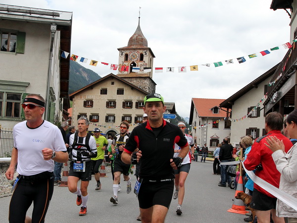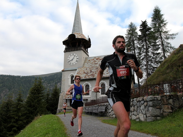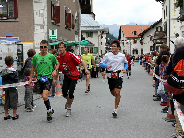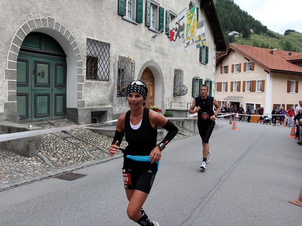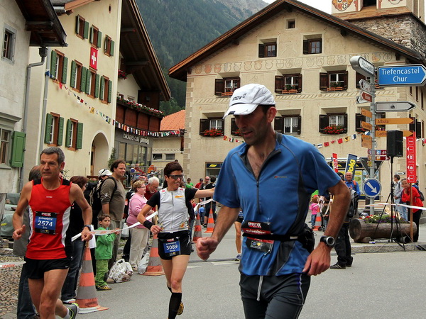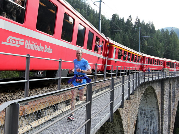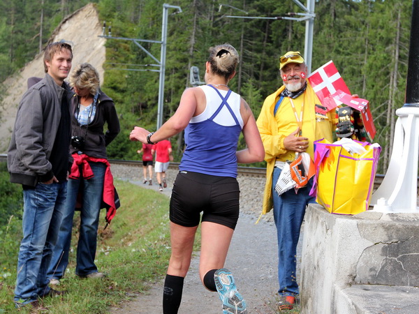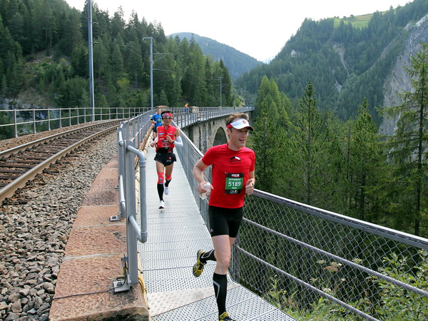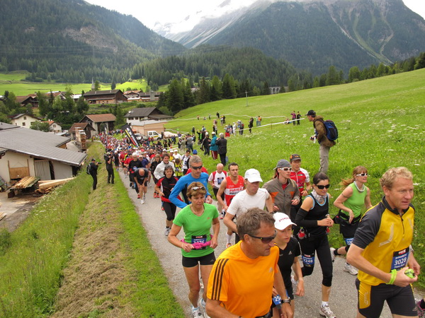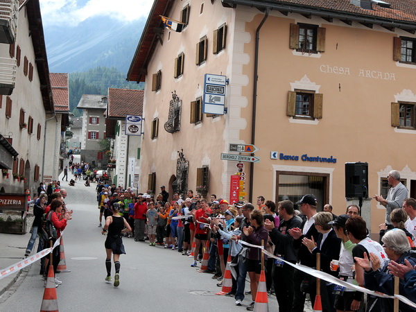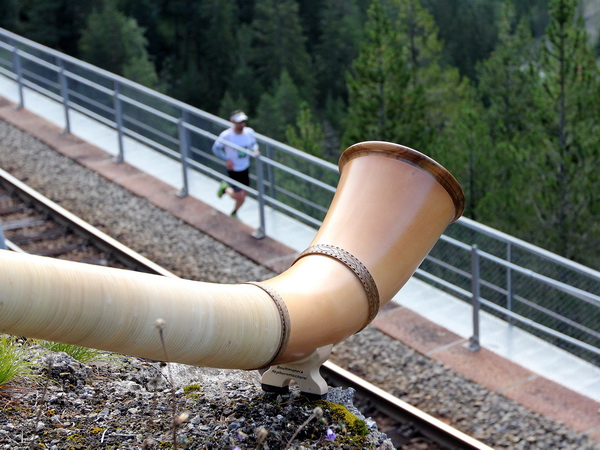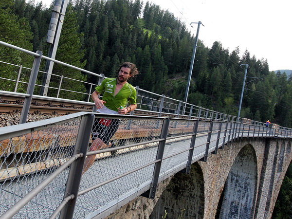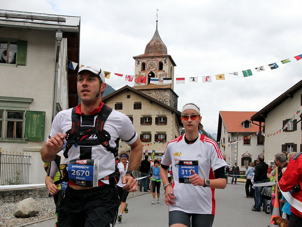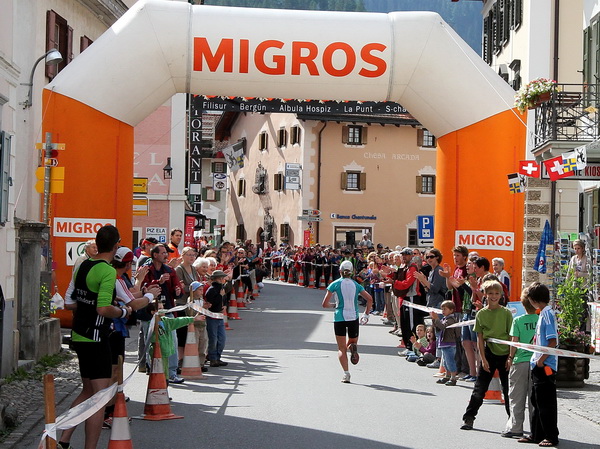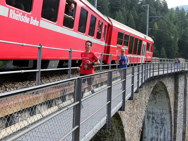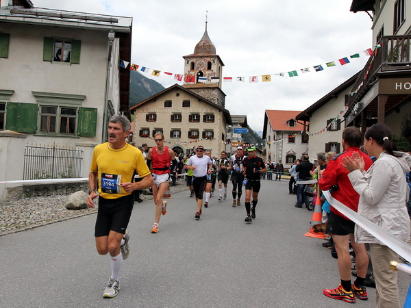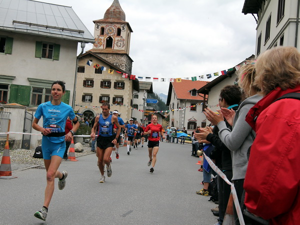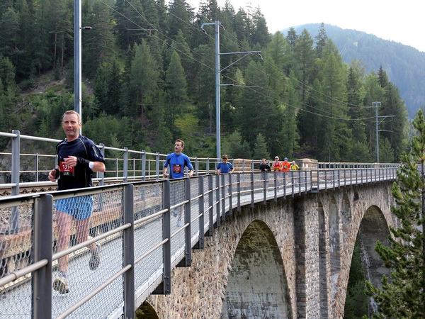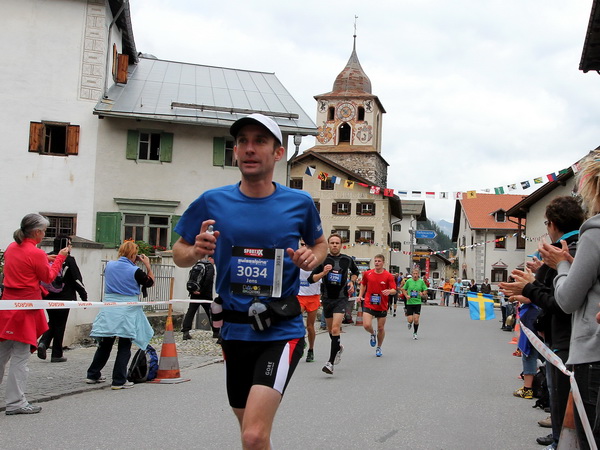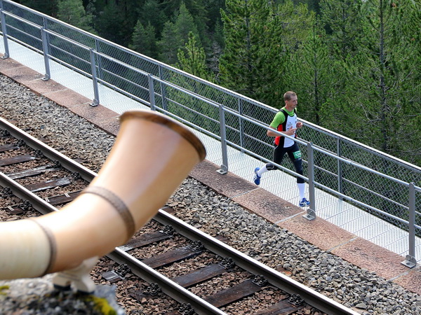 In Bergün (1365 m) ist derweil der Teufel los. Über 1100 Läuferinnen und Läufer machen sich fertig für ihren Lauf, die anderen haben bereits annähernd die Marathondistanz hinter sich und werden stürmisch beklatscht. Mittelpunkt und Wahrzeichen des Ferienortes ist der Platzturm La Tuor aus dem 13. Jahrhundert mit seiner für das Engadin typischen Malerei. Auch viele der alten Häuser im Ortskern sind bemalt und mit Erkern und kunstvollen Fenstergittern verziert.