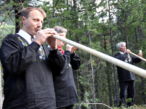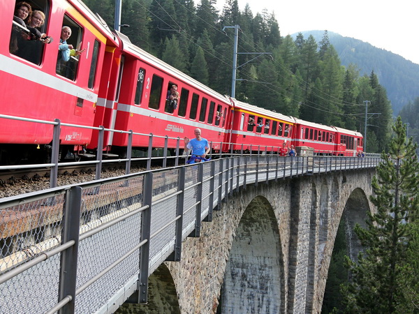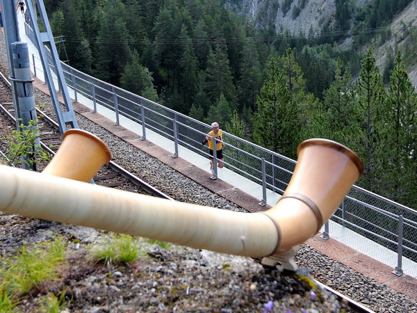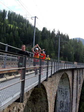 Einer der Höhepunkte des K 78 ist zweifellos das Wiesner Viadukt. 88 Meter hoch ist die Eisenbahnbrücke und 210 m lang. Teresa kann da gar nicht hinschauen, hält sich die Hand vor die Augen. Ansonsten wird über die klapprigen und schwingenden Roste gedonnert, was das Zeug hält. Wer Glück hat, begegnet einem Zug und wird von den Fahrgästen bejubelt. Ansonsten sind für die Stimmung die Alphornbläser und das Alpine-Original Röby mit Glocke und Tröte zuständig.