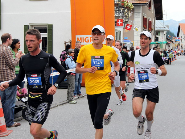 Der Start des K 42 ist in einer Nebenstraße und völlig unspektakulär. Wenn man aber den ersten Anstieg gleich zu Beginn hinter sich hat, eine weitläufige Schleife gelaufen ist und sich wieder in den Ort hochgekämpft hat, mischt man sich unter die jetzt zahlreicher eintreffenden K 78er und lässt sich mit ihnen von den vielen Zuschauer feiern. Die Dorfstraße hoch wird man von der Begeisterung förmlich getragen. Ganz am Ende nimmt dann der Geräuschpegel ab. Gleichzeitig wird die Luft knapper. Das kurze Gefälle kommt gerade recht.