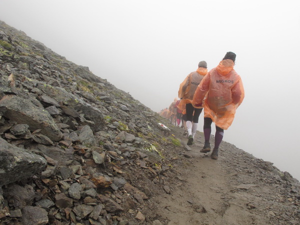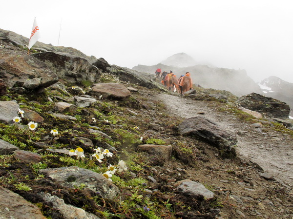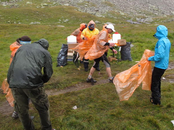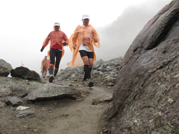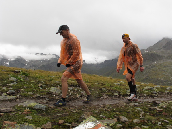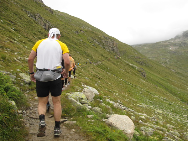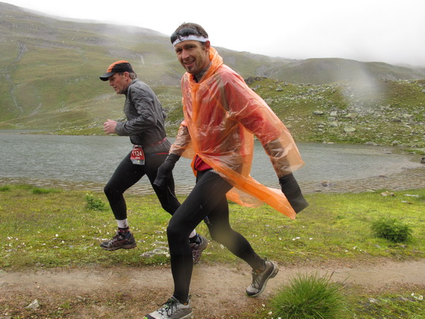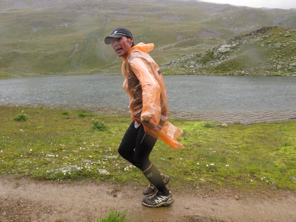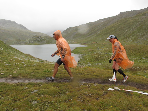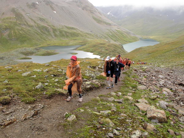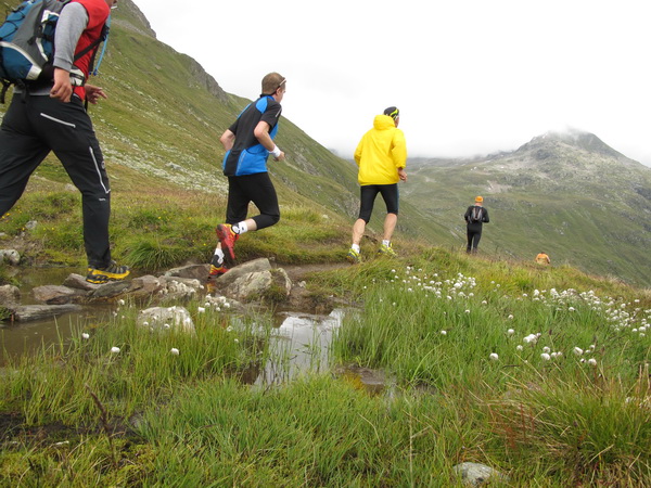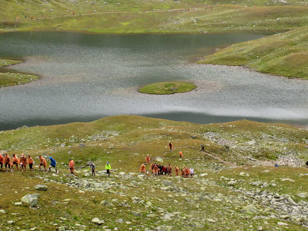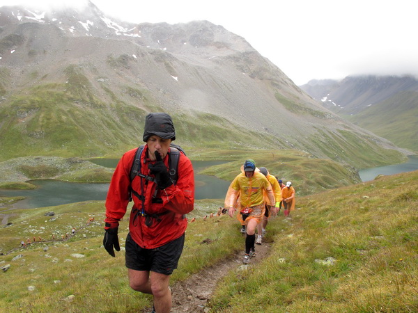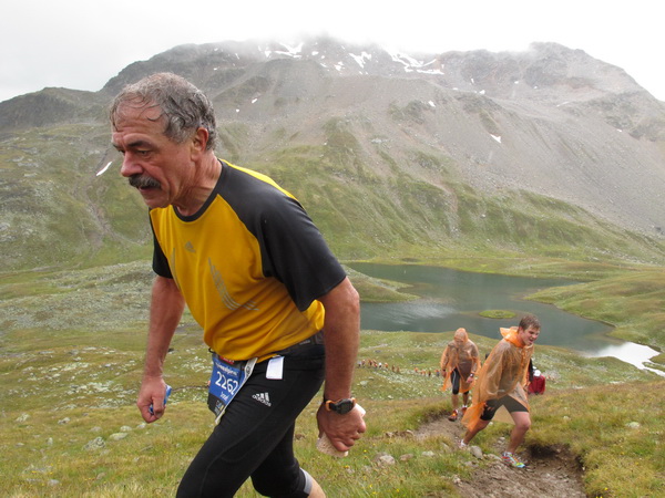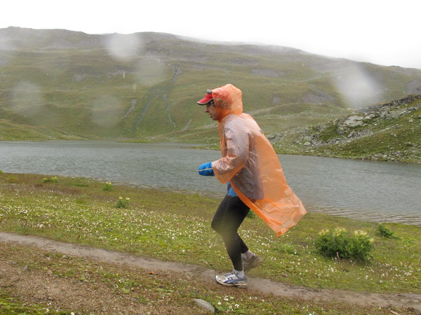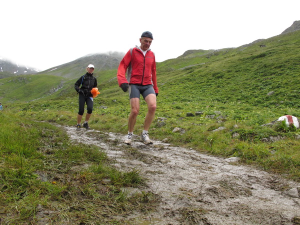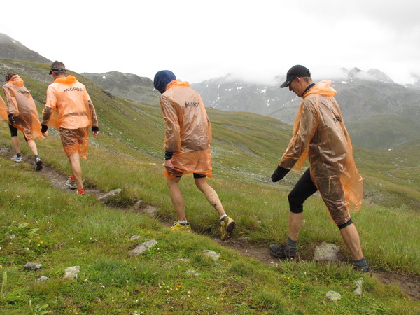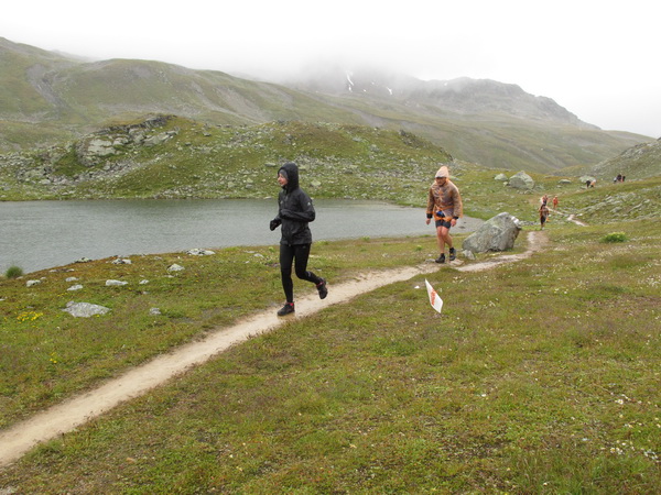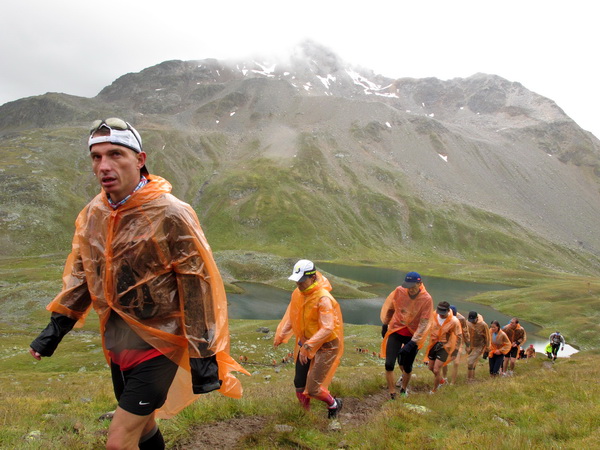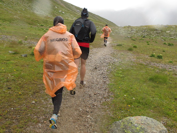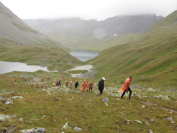 Ich bin entsetzt, wie lange es abwärts und dann dem Panoramatrail entlang geht. Ich dachte, wir steigen von der Keschhütte geschwind die fehlenden gut 100 Höhenmeter auf zum Sertigpass. Nichts da, fast 400 m büßen wir bei dem Abwärtslauf ein, bevor wir die Richtung ändern und zunächst zu den Ravaischseeen (2570 m) aufsteigen. Vor gerade einmal 90 Minuten war meine Frau noch hier und hat bei herrlichem Wetter Fotos gemacht. Jetzt regnet es und es ist so kalt, dass ich Mühe habe, an meinem Foto zu hantieren oder zum zigten Mal das Objektiv zu reinigen. Ich überlege tatsächlich, mir über die Finger die pinkeln, um sie zu wärmen. Dann frage ich lieber einen Kameraden, ob er mir seine Handschuhe leiht, er würde meine lange Hose dafür kriegen. Fairerweise lehnt er ab. Die Handschuhe seien nass und er könne sie ebenso gut wegschmeißen. Na ja, für meine Hose gilt das ja auch.