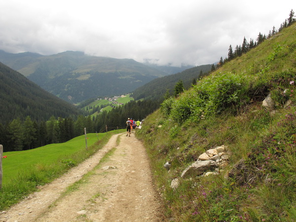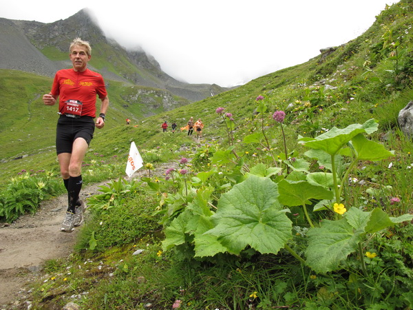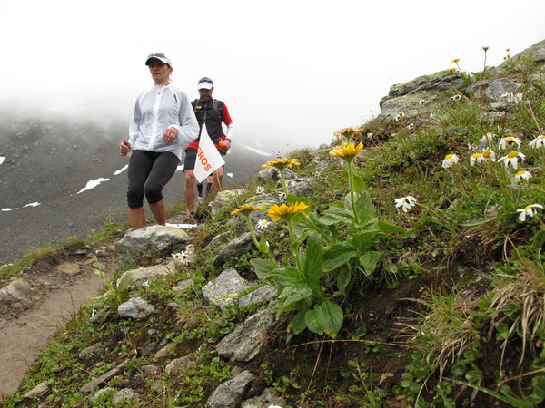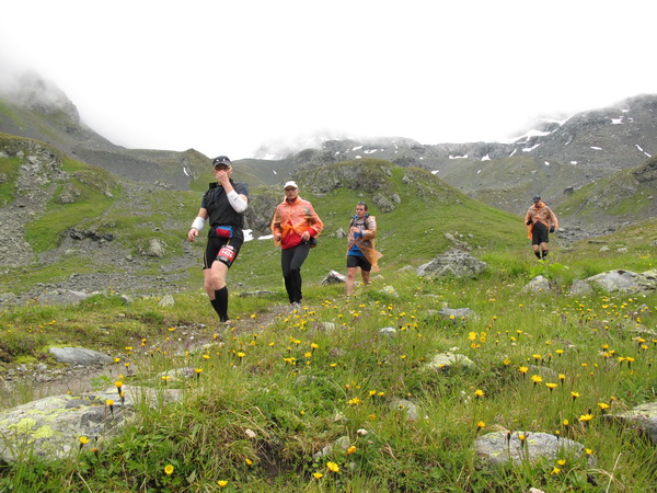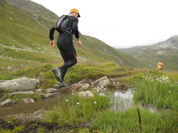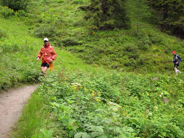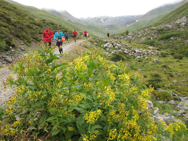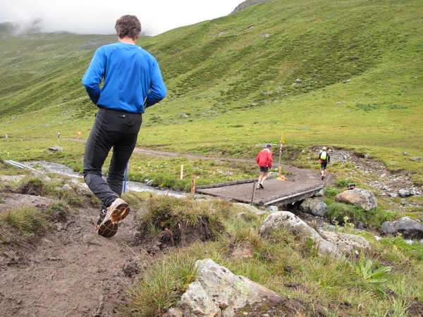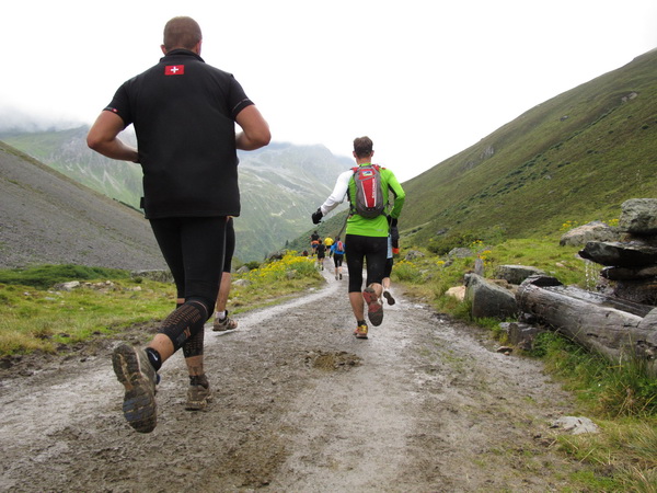Zwei Boullion, ein Cola und drei Stückchen vom Alpine-Brötli und ich bin wieder hergestellt. Den Rest werde ich schon noch packen. Es geht ja nur noch bergab, wird uns verheißen. Zunächst trifft das ja auch zu, sehr heftig sogar. Das geht mächtig in die Beine. Dazu muss man auf dem rutschigen Geläuf noch höllisch aufpassen. Das Sertigtal ähnelt dem Dischmatal, durch das wir sonst nach Davos laufen, nur oberflächlich betrachtet. Es ist steiler und wilder und die Wege sehr viel schlechter. Das können auch die blühenden Almwiesen weiter unten nicht kaschieren. Trailrunning ist angesagt.