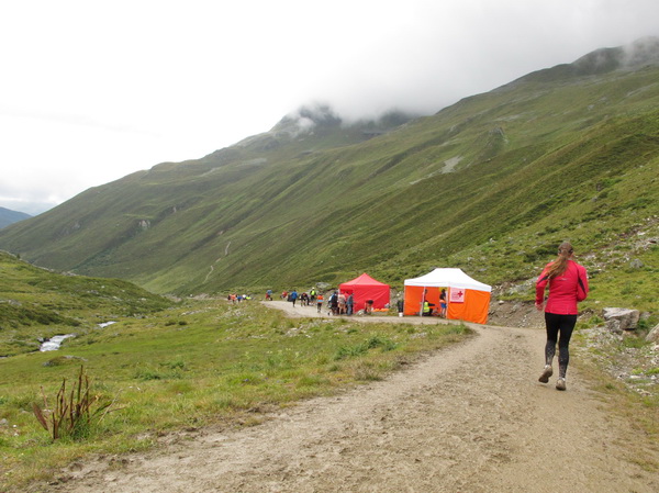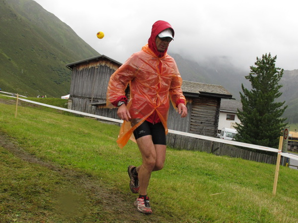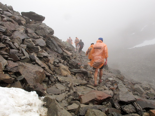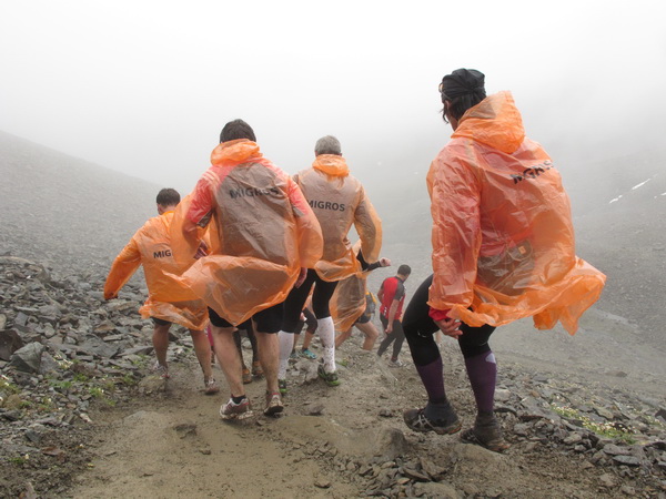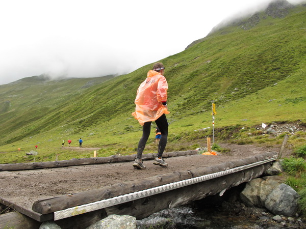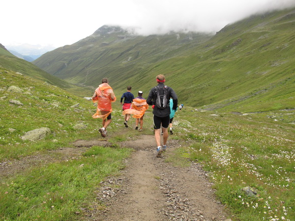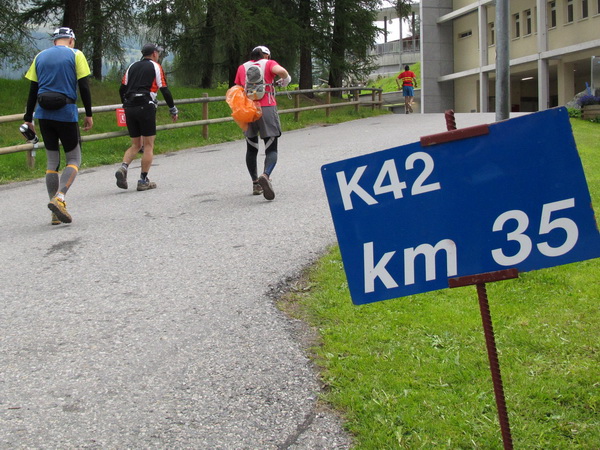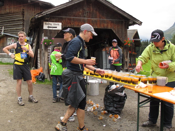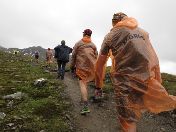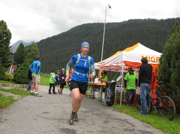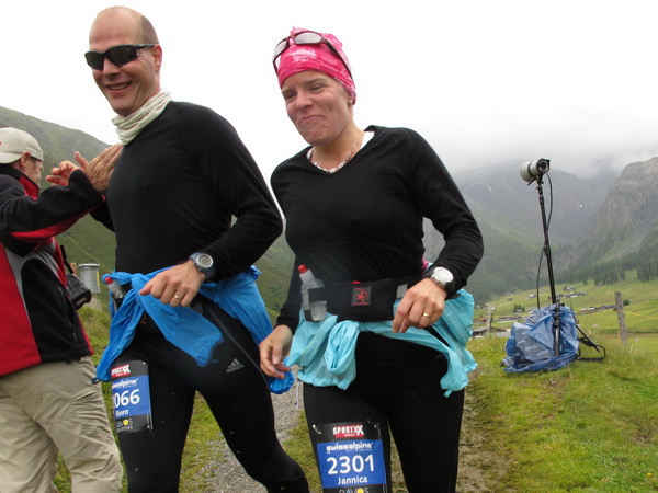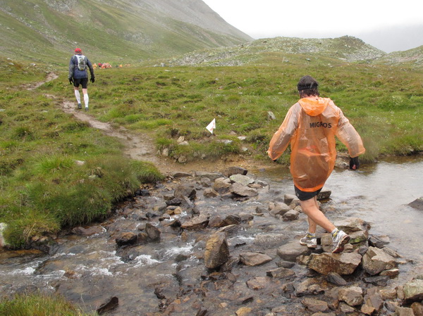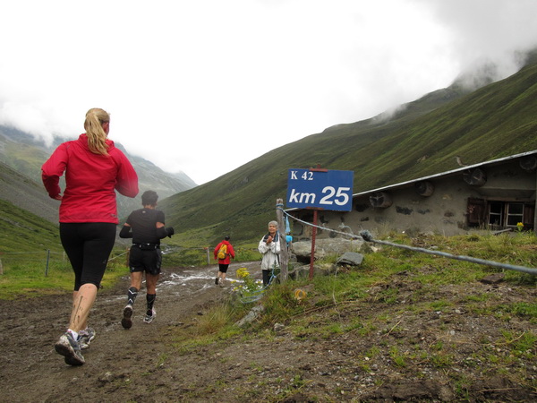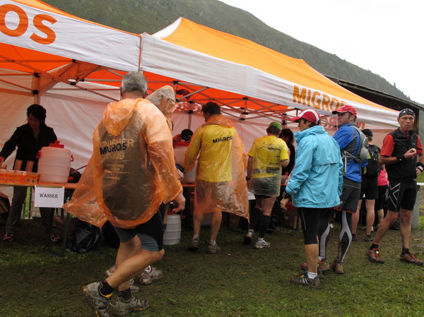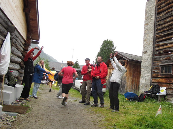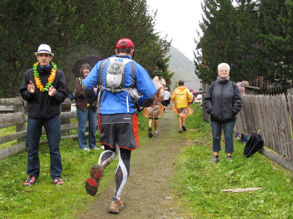 Sertig Dörfli (1861 m, 28 km), das sind nur ein paar Häuser und Ställe, aber für die Alpines so was wie die Rückkehr in die Zivilisation. Trotz des schlechten Wetters sind viele Zuschauer hier, um die geplagten Läufer willkommen zu heißen. Noch 14 Kilometer …
