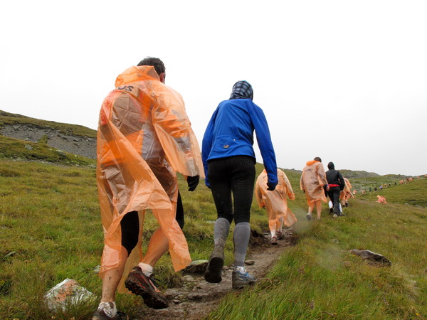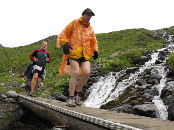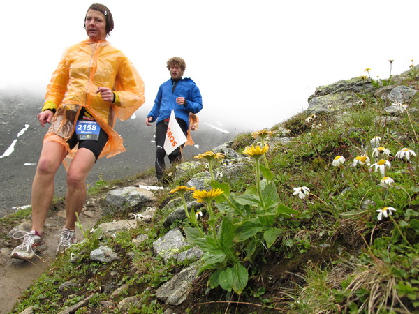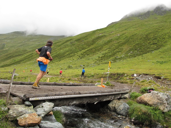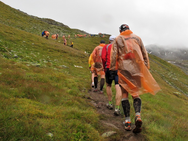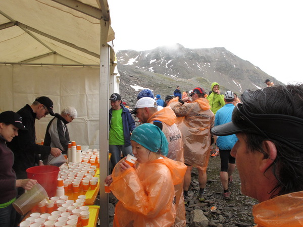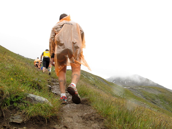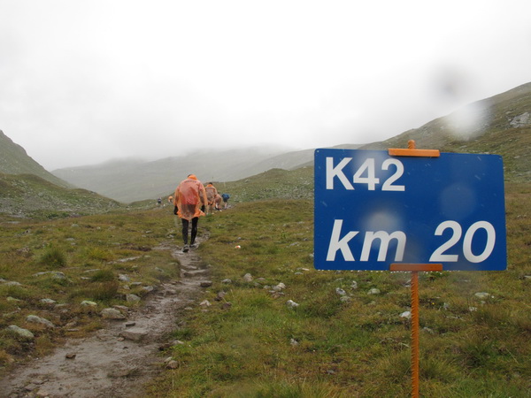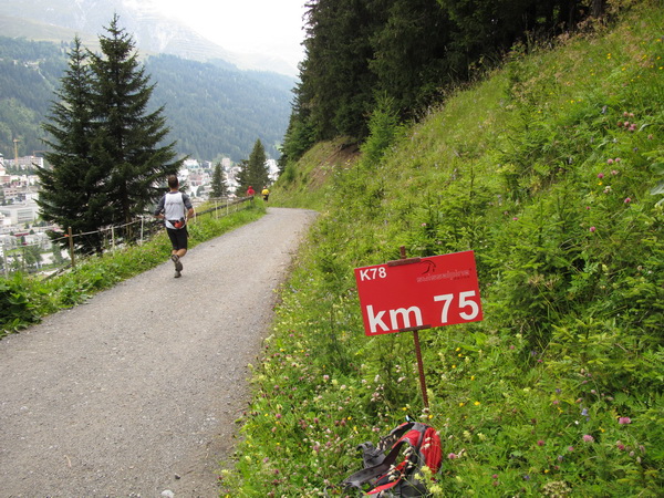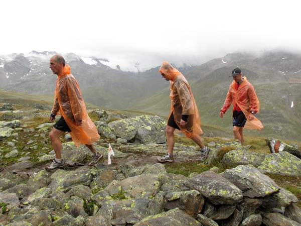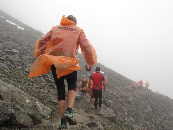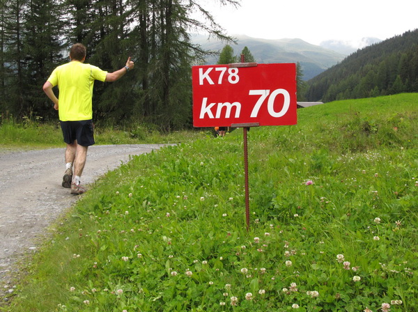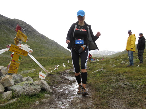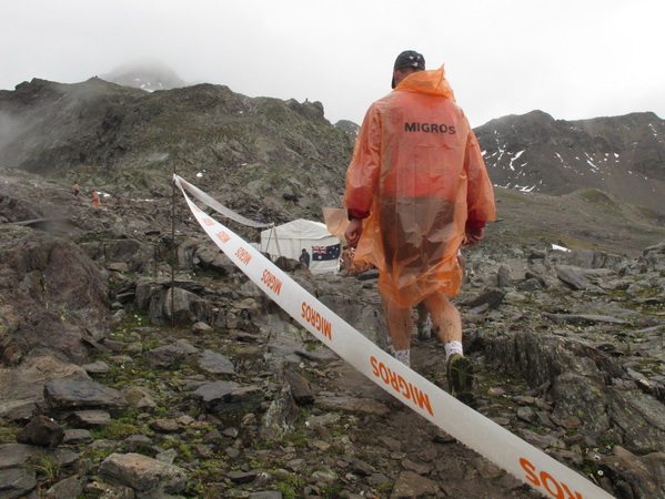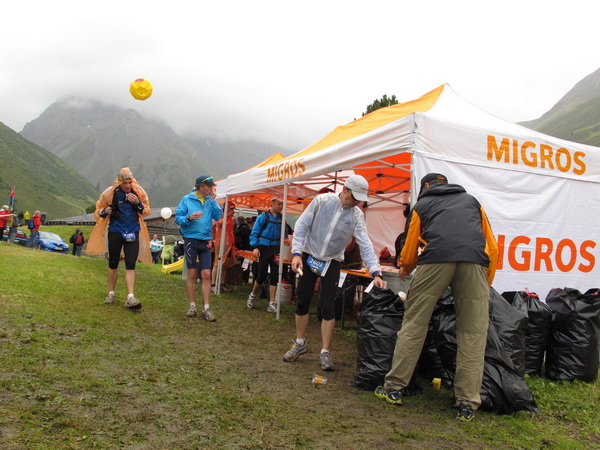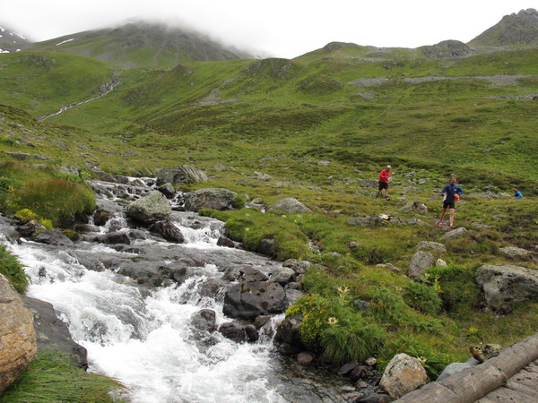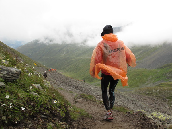 Sertig Dörfli (1861 m, 28 km), das sind nur ein paar Häuser und Ställe, aber für die Alpines so was wie die Rückkehr in die Zivilisation. Trotz des schlechten Wetters sind viele Zuschauer hier, um die geplagten Läufer willkommen zu heißen. Noch 14 Kilometer …