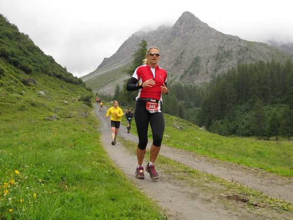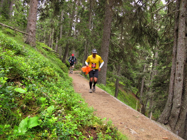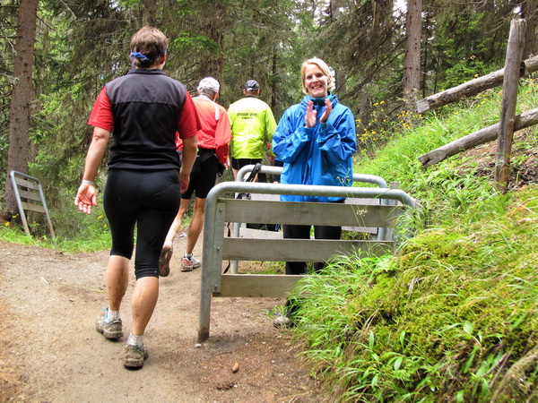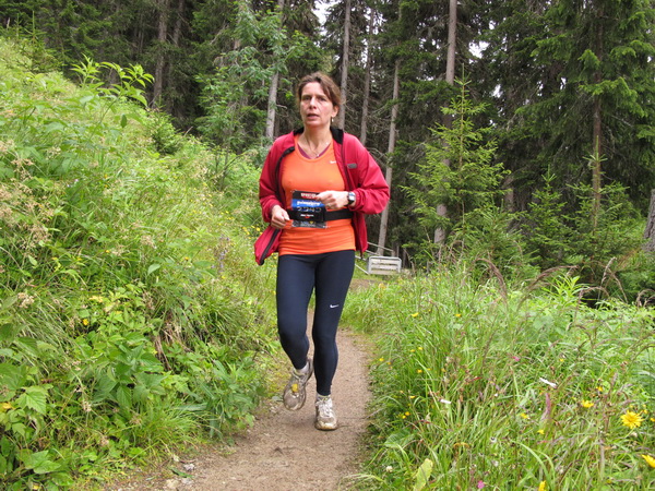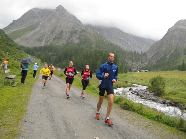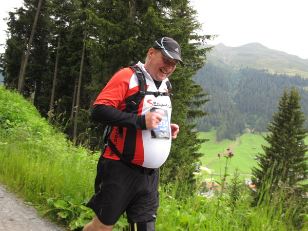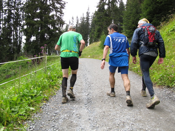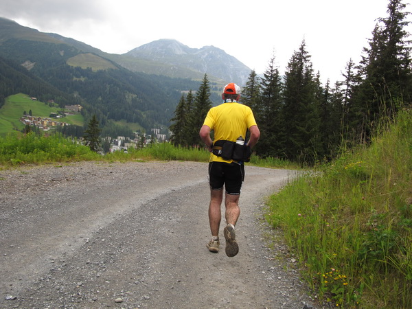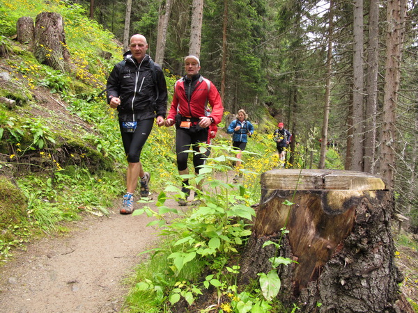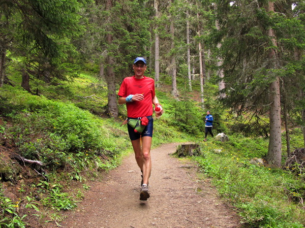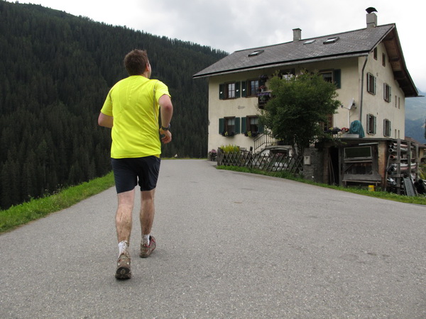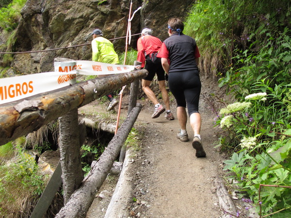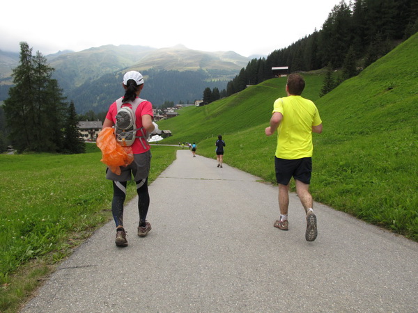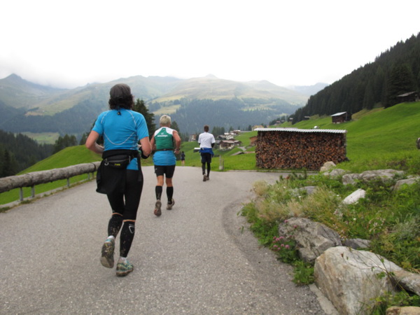 Ich liebe das Dischmatal. Gemütlich und ohne besondere Schwierigkeiten schlängelt sich der Weg durch Wiesen dem Bach entlang, der Blick ist frei bis Davos, das man nach genussvollem Lauf erreicht. Das Sertigtal ist das Gegenteil. Ungemütlich und mit großen Schwierigkeiten führt ein schmaler Weg durch dunkle Wälder. Nur manchmal gibt eine Lichtung den Blick ins Tal frei. Ich bin gerade dabei, übelste Verwünschungen auszustoßen, da strahlt mich eine blonde Schönheit an. Es ist Heike. Und das Beste: Sie hat den Rucksack voller Köstlichkeiten, den ihr Mann, weil wahrscheinlich weit hinter mir, noch nicht plündern konnte.
