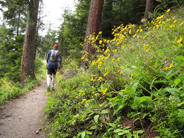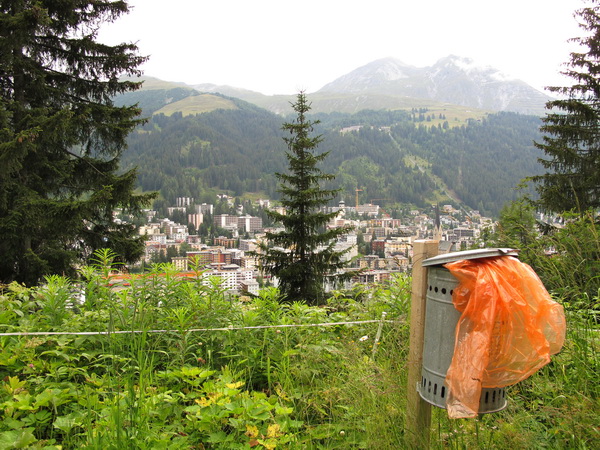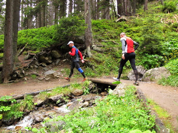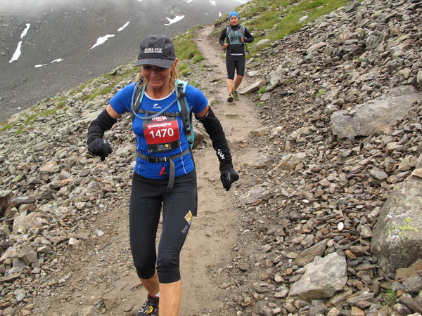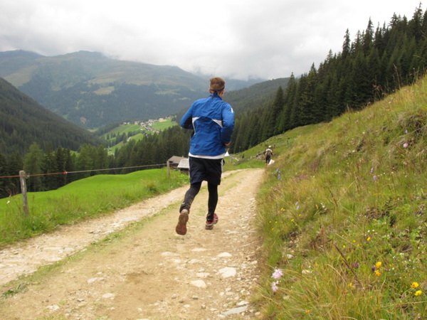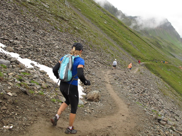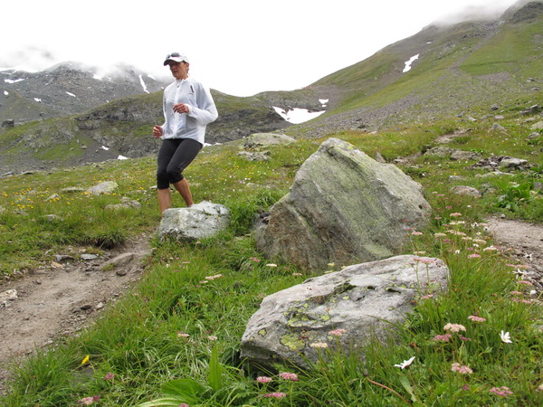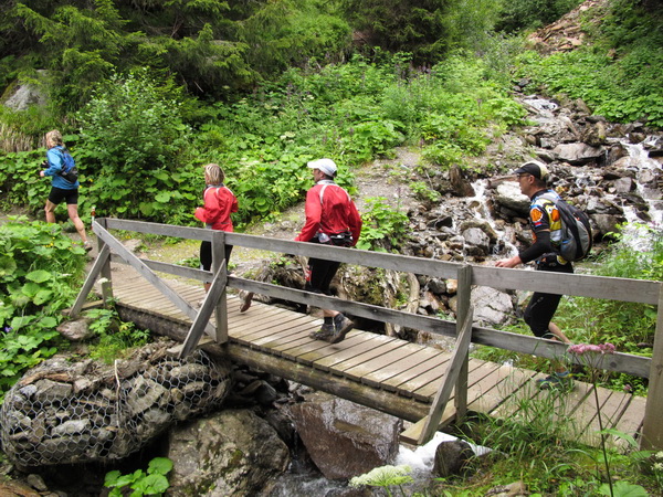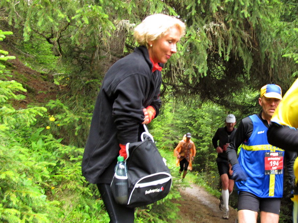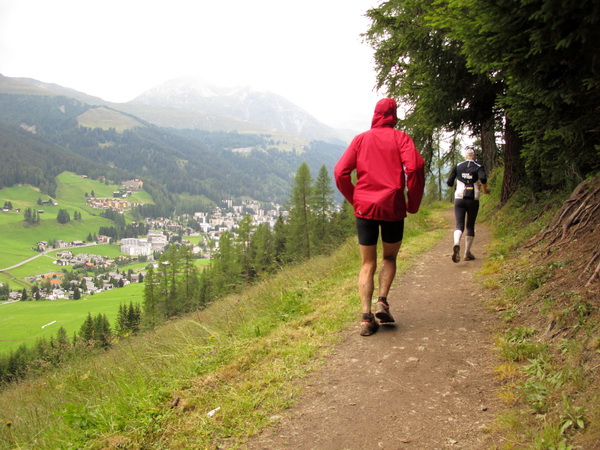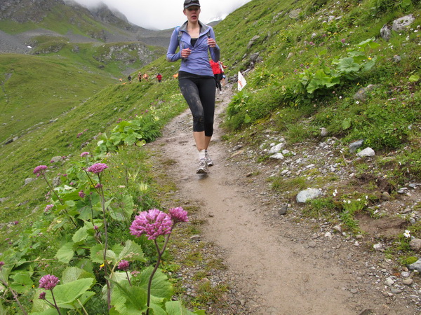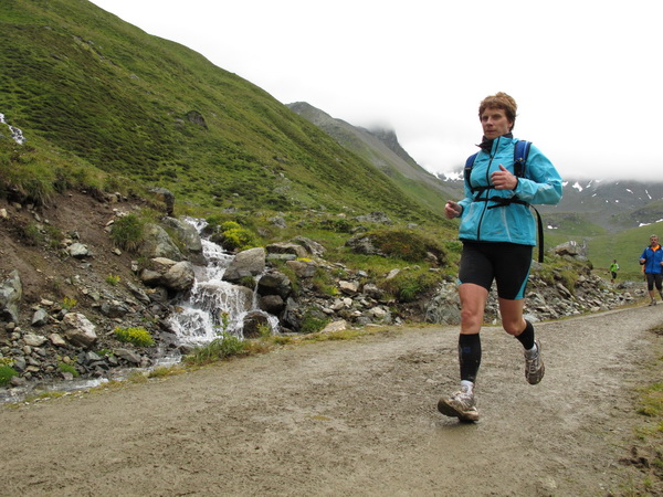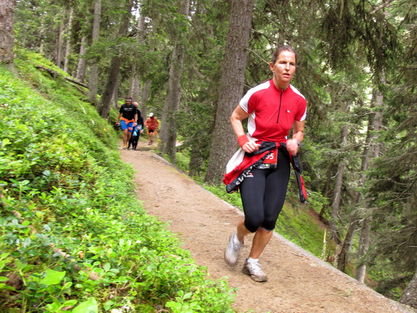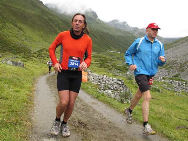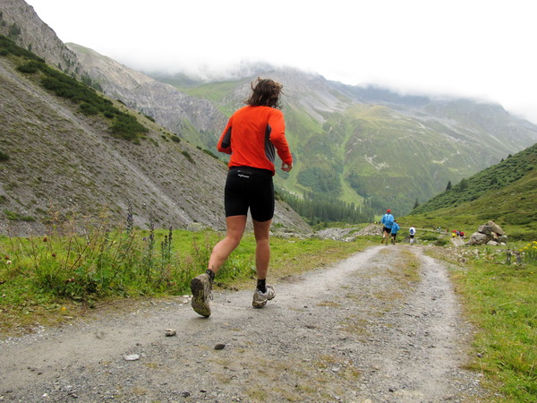 Ich liebe das Dischmatal. Gemütlich und ohne besondere Schwierigkeiten schlängelt sich der Weg durch Wiesen dem Bach entlang, der Blick ist frei bis Davos, das man nach genussvollem Lauf erreicht. Das Sertigtal ist das Gegenteil. Ungemütlich und mit großen Schwierigkeiten führt ein schmaler Weg durch dunkle Wälder. Nur manchmal gibt eine Lichtung den Blick ins Tal frei. Ich bin gerade dabei, übelste Verwünschungen auszustoßen, da strahlt mich eine blonde Schönheit an. Es ist Heike. Und das Beste: Sie hat den Rucksack voller Köstlichkeiten, den ihr Mann, weil wahrscheinlich weit hinter mir, noch nicht plündern konnte.