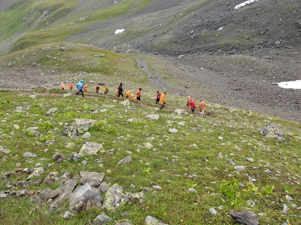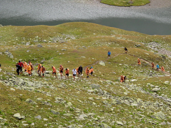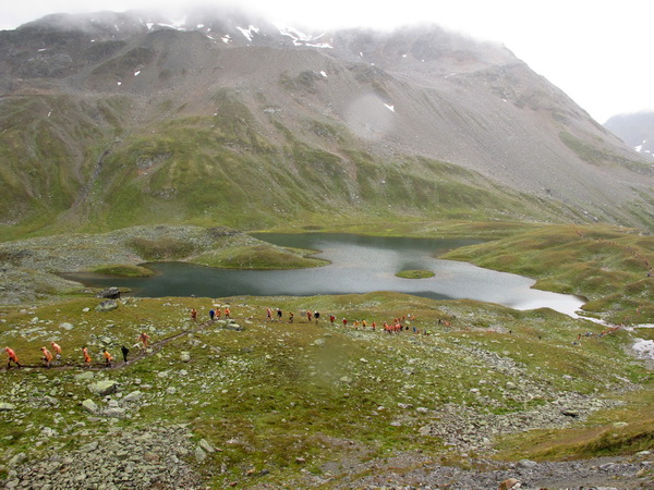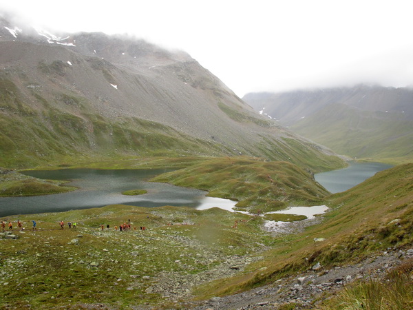 Trotzdem empfinde ich die Landschaft als traumhaft schön. Die Seen liegen auf verschiedenen Höhen, verbunden durch einen schmalen Bach, den wir queren. Um uns türmen sich die Berge bis auf über 3000 m auf. Den Sertigpass (2739 m, ca. 21 km) kann man gut erkennen. Wie orangefarbenen Perlen an der Schnur schlängeln sich die Alpines dort nach oben.
