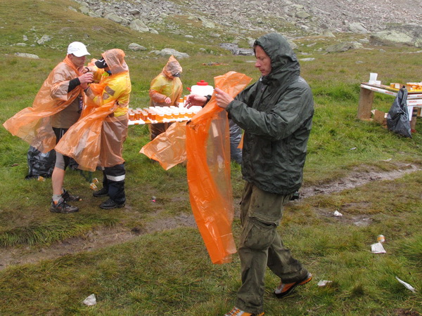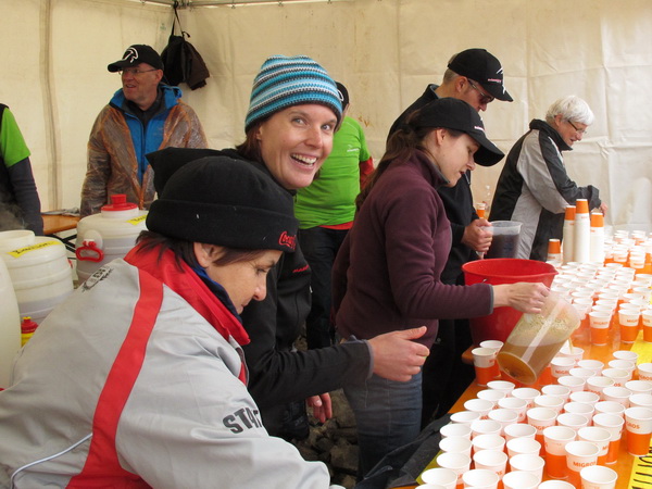 Unglaublich, mit welcher Freude die zahlreichen Helferinnen und Helfer nicht nur hier im Einsatz sind. Ich sehe nur lachende Gesichter. „Für Dich habe ich einen Windstopper in Deiner Lieblingsfarbe“, sagt eine Helferin in Anspielung auf meine orangene Mütze und hält mir einen Umhang entgegen. „Da, den schenkt Dir Mirgros.“ Ein toller Laden muss das sein.