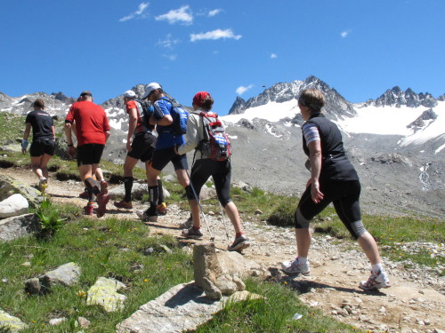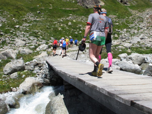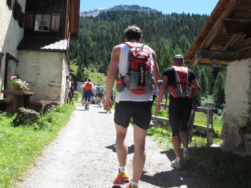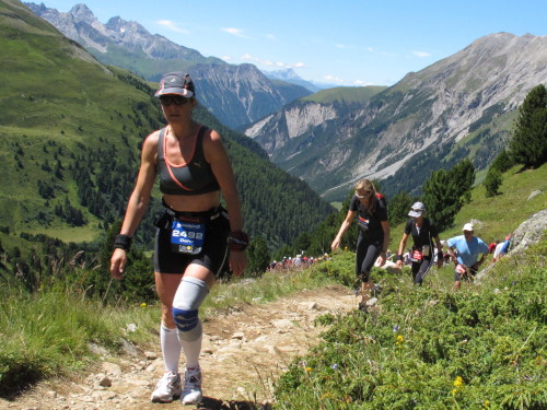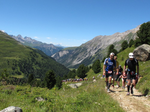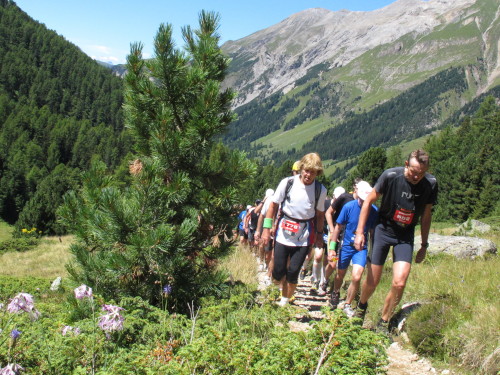 Auf den nächsten gut 5 Kilometern steigt die Strecke um 810 Meter an. Es beginnt ganz gemütlich nach der Holzbrücke in weitläufigen Serpentinen durch schattigen Wald. Aber bald wird es steiler, steiniger und immer unwegsamer. Dann sind wir jenseits der Baumgrenze. Der schmale Pfad schlängelt sich steil durch Almwiesen, deren Grün immer spärlicher wird und schließlich einer Stein- und Felswüste weicht. In langen Kolonnen marschieren die Alpines nach oben. Keiner drängelt, keiner schimpft. Zwei Verpflegungsstellen hat man auf diesem Streckenabschnitt eingerichtet. Das reicht, weil es trotz intensiver Sonne heute nicht zu warm ist. Ansonsten ist es schon zu empfehlen, zumindest eine Trinkflasche mitzuführen.