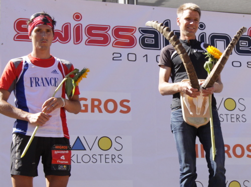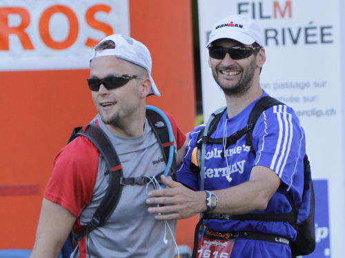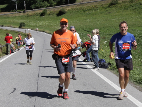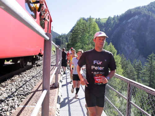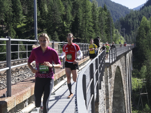 Es geht noch einmal kurz steil bergan und dann nur noch abwärts bis Filisur (1032 m - km 31). Man hört schon Durchsagen über die im ganzen Ort aufgestellten Lautsprecher. Zuvor holt mich Eberhard ein, der das Kapitel Swissalpine wegen dem Zeitfenster eigentlich auch abgeschlossen hatte. Jetzt ist er mit großer Begeisterung erneut dabei. Kurz vor dem Ort überholen uns die ersten K31-Läufer, schon bald darauf kommen die Führenden des K78, unter ihnen der Schwede Jonas Buud, der schon dreimal gewonnen hat.