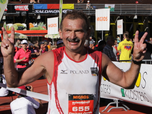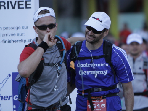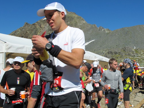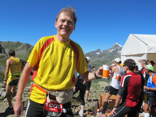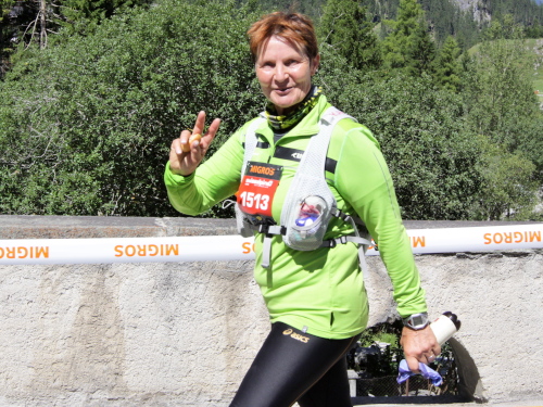 Am Scalettapass (2606 – km 60) lasse ich mir die Wunden versorgen. Die zwei Mädels freuen sich, dass es was zu tun gibt und ich genieße ihre Fürsorge. Während sie sprühen und verpflastern, lasse ich mir von einer Dritten Waden und Schenkel massieren. Sie soll nie aufhören. Auch Dirk fühlt sich gut, der Jubiläums-Swissalpine und sein 100. Marathon fallen nämlich nicht ganz zufällig zusammen. „So ein Lauf und so ein Wetter …“ Er strahlt mit der Sonne um die Wette. Mit der Startnummer 1000 belegt er am Ende Platz 700 und in der AK wird er 102. Warum hat er die Zwei nicht mehr geschafft?