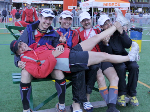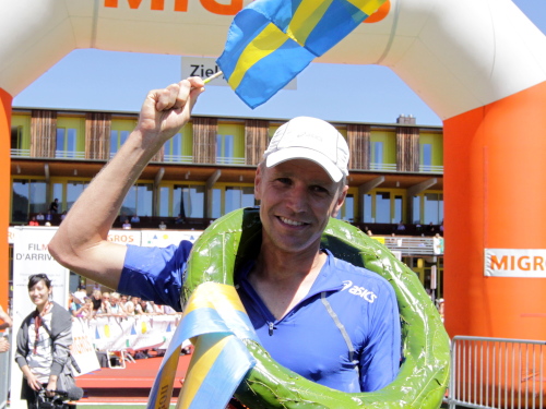 Am Ende der Brücke steht Röby mit zwei großen Kuhglocken und wie immer bunt kostümiert. Was der Didi für die Tour de France, ist der Röby für den Swissalpine. Hat er hier seinen Job getan, geht er auf die Walkingstrecke, um den Zieleinlauf als Aktiver zu erleben. Ein echtes Original.