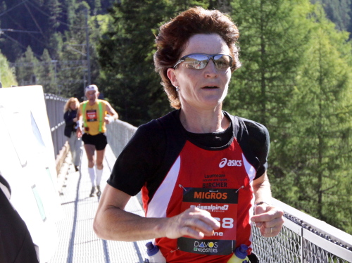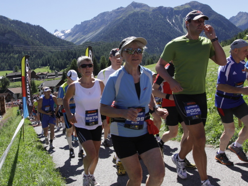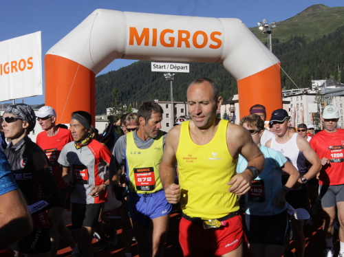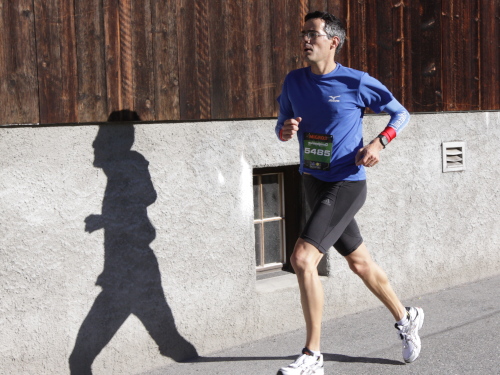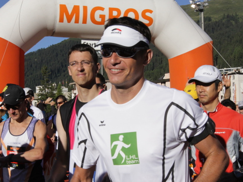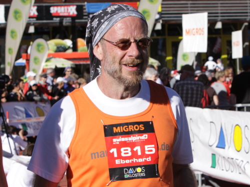 Bei mir ist es heute eher so mittendrin. Ich bin schon besser gelaufen, aber trotzdem heilfroh, es überhaupt geschafft zu haben. Den letzten Anstieg am Talausgang hinauf auf den Aussichtsweg habe ich einkalkuliert. Röby, der in der Frühe noch für gute Laune am Wiesner Viadukt sorgte, ist mit seinen Stöcken auf den letzten Kilometern. Und auf einer Bank sonnt sich Pius App, der Schatzalp-Hotelier, weil er wieder einmal als einer der Letzten ins Ziel kommen will.