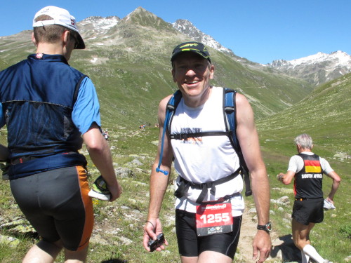 Steil und unwegsam geht es abwärts, dann wird der legendäre Panoramatrail erreicht. Ungefähr sieben Kilometer zieht er sich immer auf einer von um die 2500 m dahin, mal rauf mal runter, über Bäche und Rinnen, steile, blühende Wiesenhänge, Felsen und manches Jahr auch über Schneefelder. In diesem Jahr ist nur eines übrig geblieben. Nicht groß, aber es reicht. Als ich das letzte Stück mit einem langen Schritt überwinden will, rutscht mir das Standbein weg und es haut mich voll in den Dreck. Ein Wintersportler werde ich wohl nie. Vor Schreck kann ich mich einen Moment kaum rühren. Sofort sind ein paar Läufer da, wollen helfen. Aber es ist nichts passiert, nur Hand und Schienbein blutig aufgeschürft. Es kann weiter gehen.