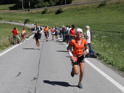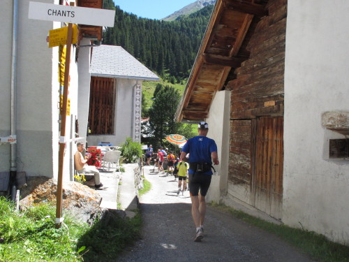 Zuerst ist der Weg ins Val Tuors noch geteert, dann wird er etwas schmaler und steinig. Die Steigung ist aber meist moderat und ich kann weite Strecken entlang des tosenden Gebirgsbachs laufen. Trotzdem werde ich ständig überholt, was aber für keinen ein Problem ist. Längst habe ich die Marathondistanz hinter mir. Länger bin ich seit drei Jahre nicht gelaufen. Ich nehme es gar nicht zur Kenntnis. Ich fühle mich gut, habe mir die Kräfte bis hier hin gut eingeteilt. Wir erreichen die Almhütten von Davant (km 45) und wenig später Chants (1822 m – km 47).