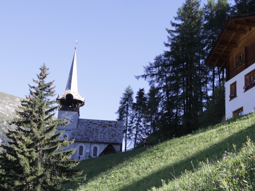 Der sonore Treichel-Klang ist schon von weitem zu hören. Es hat Tradition, dass der Bauer vom Spina-Hof die Riesen-Glocke schwingt (die ja keine Glocke, sondern eine Treichel ist) und die Alpines begrüßt. Er ist fit, seine Söhne, die ihn sonst unterstützen, liegen wohl noch in den Federn. Obwohl, wer kann bei dem Lärm schon schlafen? Getränke gibt es auch, dann geht es weiter. 30 Minuten später kommen wir zur Hööhalde mit der St. Peter-Kirche in Monstein (1626 m – km 17) , 1896/97 im Jugendstil erbaut und ein Fotomotiv erster Güte.