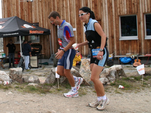 Dann aber, blaues Shirt, weiße Mütze, das muss er sein. Wer? „Der Schwede!“ Es stimmt, es ist Jonas Buud. Er hat wieder alle hinter sich gelassen. Relativ locker kommt er angetrabt. Das letzte Stück zur Hütte nimmt er in langen Schritten, lächelt nach links und rechts, erfrischt sich kurz und stürzt sich hinunter in Richtung Panoramatrail. Dann die Sensation, nur zwei Minuten später kommt schon Konrad von Allmen, der Triathlet. Er ist schon jetzt so weit gelaufen, wie niemals zuvor in seinem Leben – 53 km. Aber man sieht es ihm an, er muss kämpfen. René Fuchser kommt als Dritter, Moritz Boschung als Vierter an die Hütte. Wenig später verletzt sich Boschung und muss raus. Bis zum Ziel ändert sich dann nichts mehr, Buud gewinnt vor von Allmen und Fuchser.