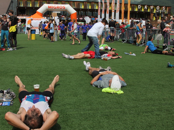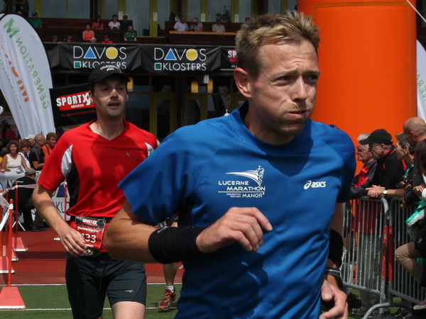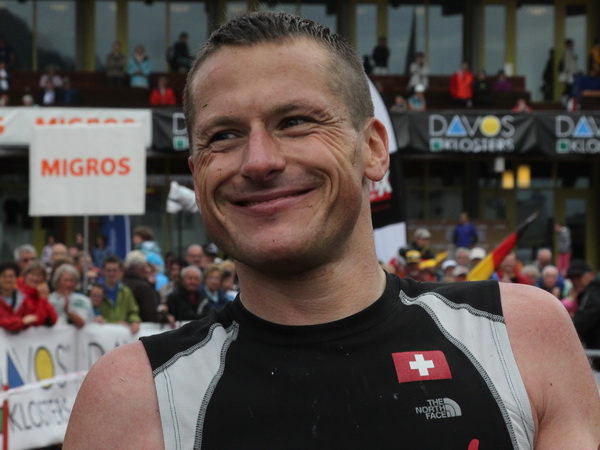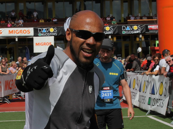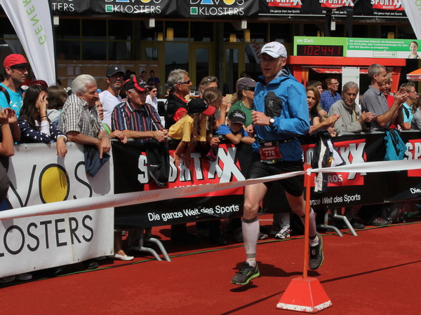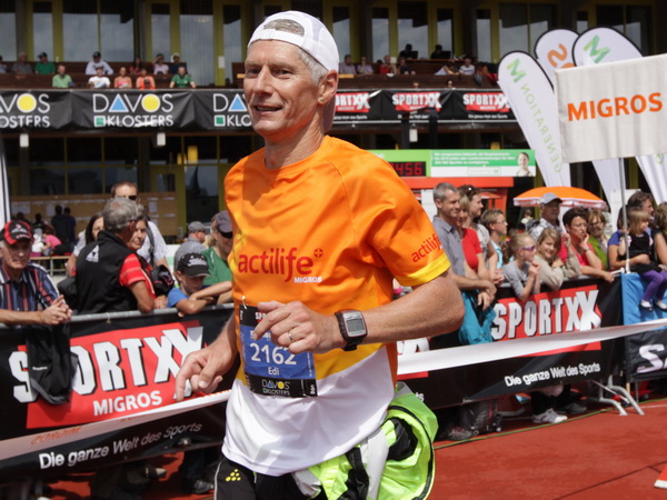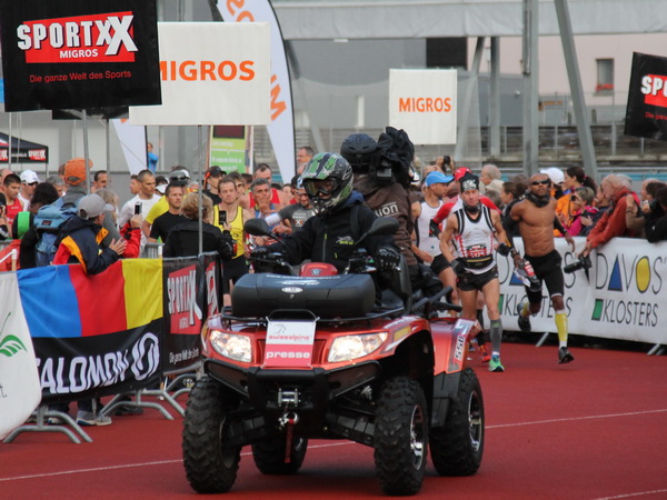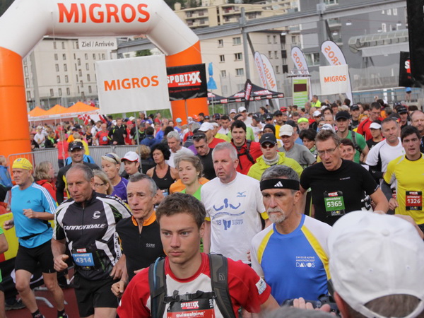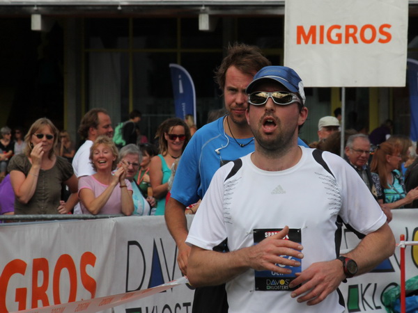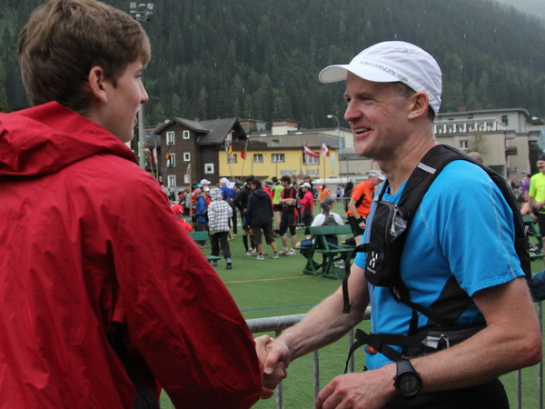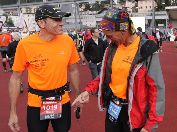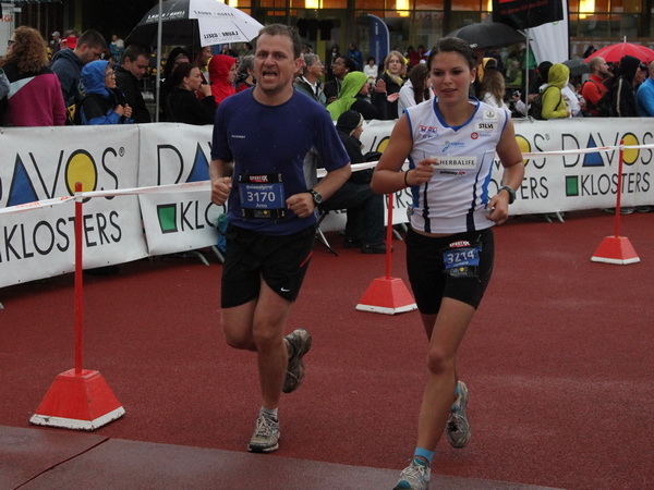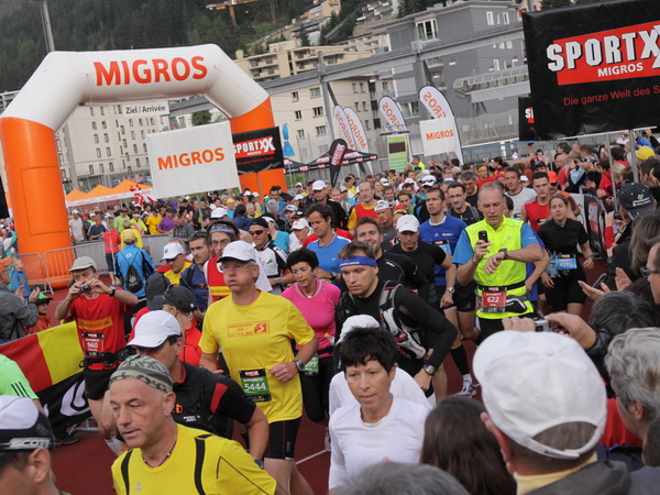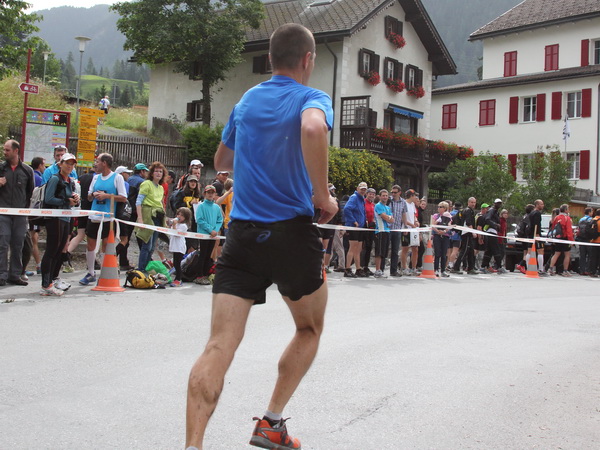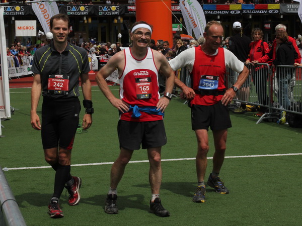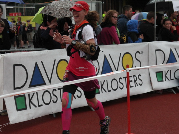 Erst bei Clavadel (1664 m, 36 km) wird das Geläuf besser, die letzten Kilometer werden auf einen guten Forststraße mit nur leichtem Gefälle bequem und einigermaßen locker gelaufen. Vor uns und noch etwas unterhalb liegt Davos. Bald ist vom Sportzentrum her schon der Sprecher zu hören. Freude und Genuss kehren zurück, trotz neuerlichem Regen, trotz bedrohlich klingendem Donner. Welch ein Empfang. Der K 42 hat mich mal wieder geschafft. Die Leute können brüllen, wie sie wollen. Ich marschiere. Erst auf der roten Rennbahn im Stadion beginne ich zu laufen und die Atmosphäre zu genießen. Wieder so ein Lauf, wieder so ein Abenteuer und eine Erfahrung, die man nur macht, wenn man sich bei einer schlechten Wetterprognose nicht das Frühstück auf’s Zimmer bringen lässt.