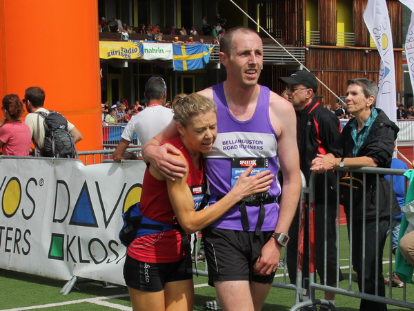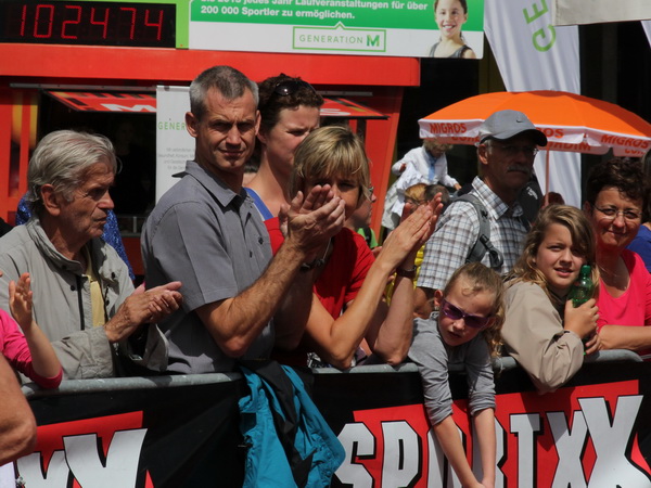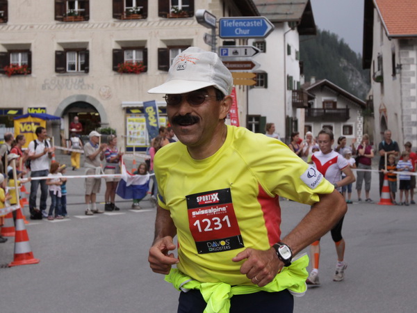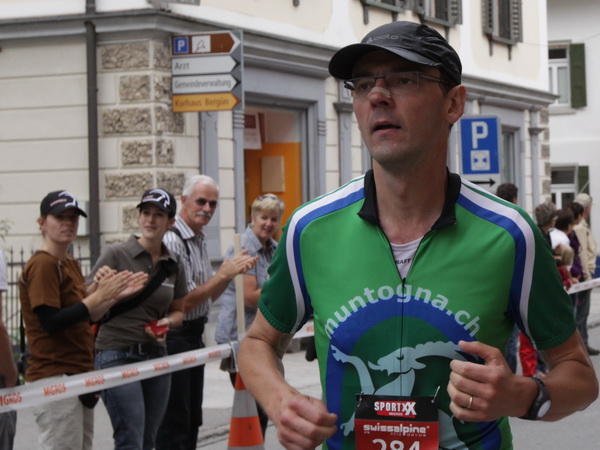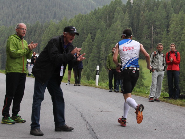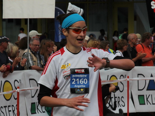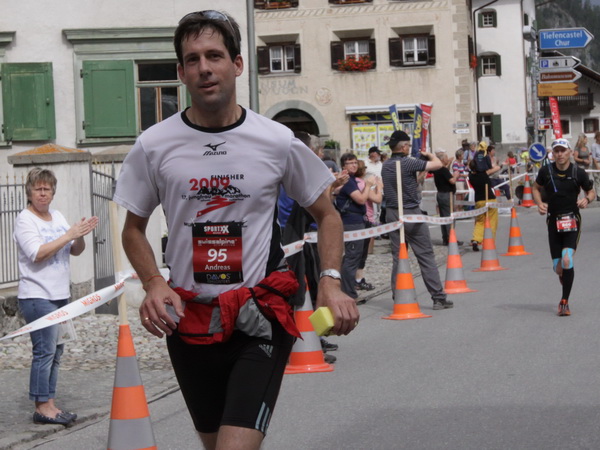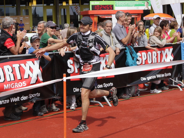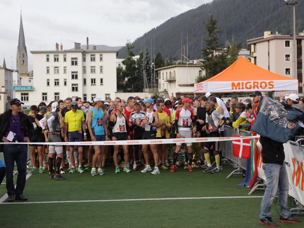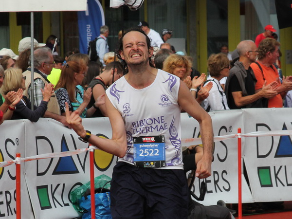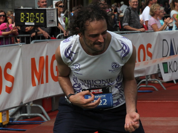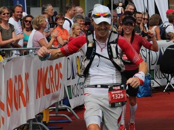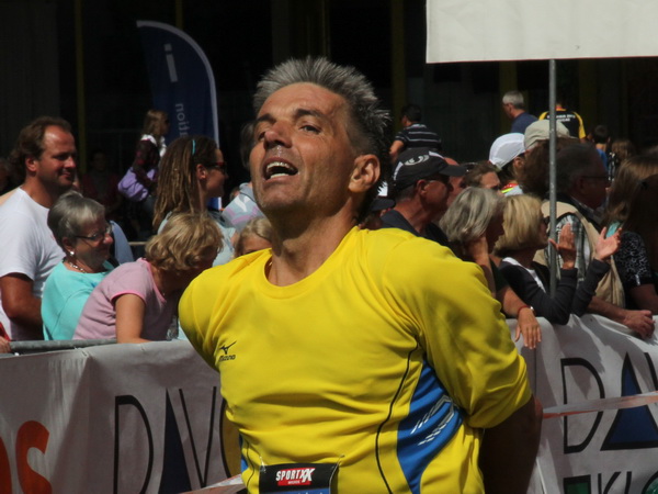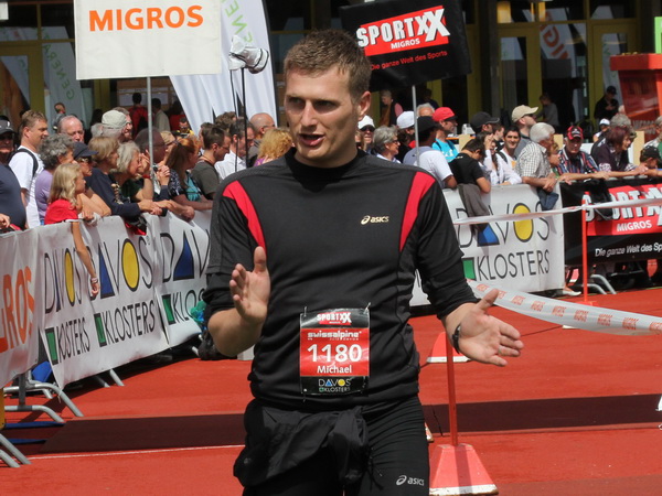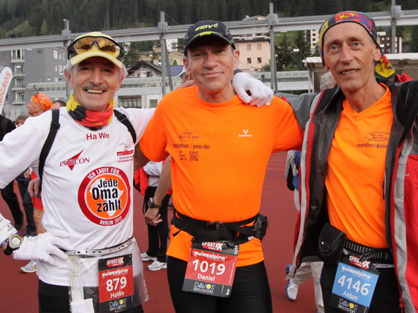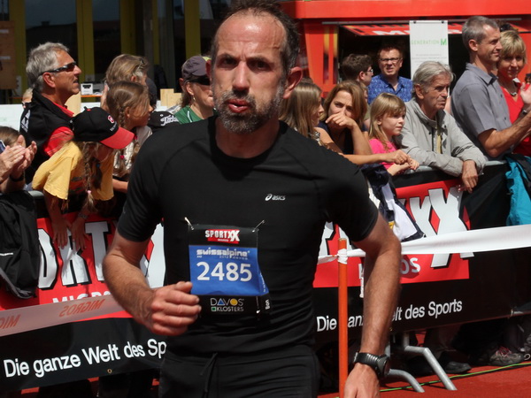 Erst bei Clavadel (1664 m, 36 km) wird das Geläuf besser, die letzten Kilometer werden auf einen guten Forststraße mit nur leichtem Gefälle bequem und einigermaßen locker gelaufen. Vor uns und noch etwas unterhalb liegt Davos. Bald ist vom Sportzentrum her schon der Sprecher zu hören. Freude und Genuss kehren zurück, trotz neuerlichem Regen, trotz bedrohlich klingendem Donner. Welch ein Empfang. Der K 42 hat mich mal wieder geschafft. Die Leute können brüllen, wie sie wollen. Ich marschiere. Erst auf der roten Rennbahn im Stadion beginne ich zu laufen und die Atmosphäre zu genießen. Wieder so ein Lauf, wieder so ein Abenteuer und eine Erfahrung, die man nur macht, wenn man sich bei einer schlechten Wetterprognose nicht das Frühstück auf’s Zimmer bringen lässt.