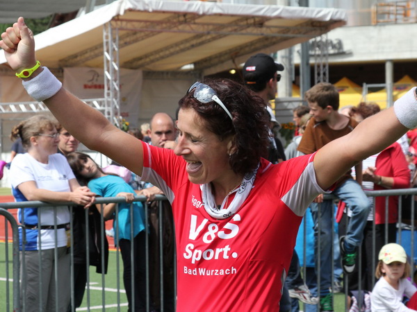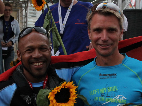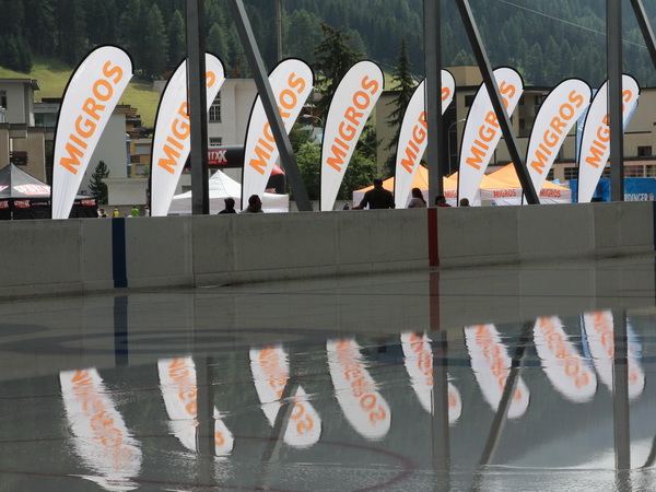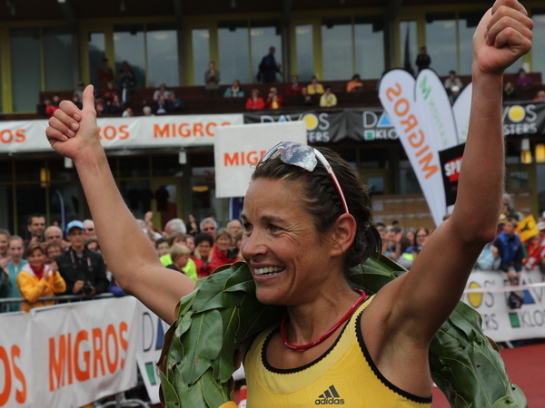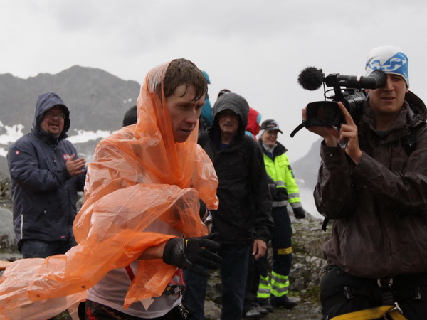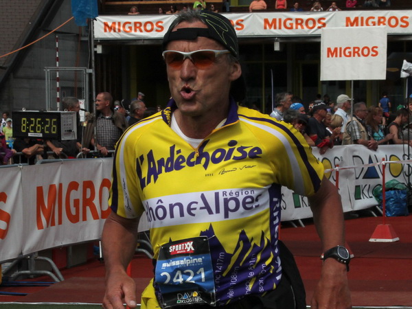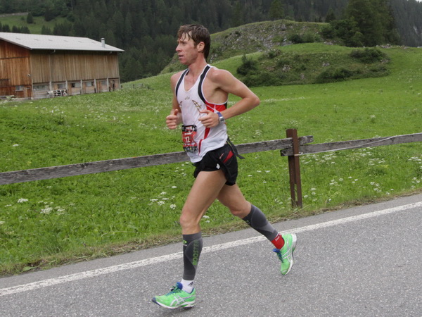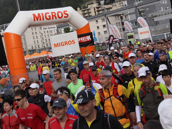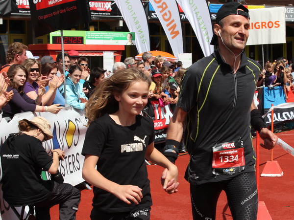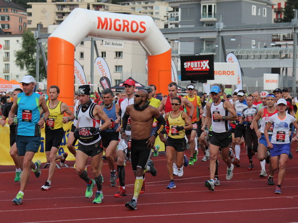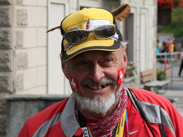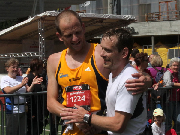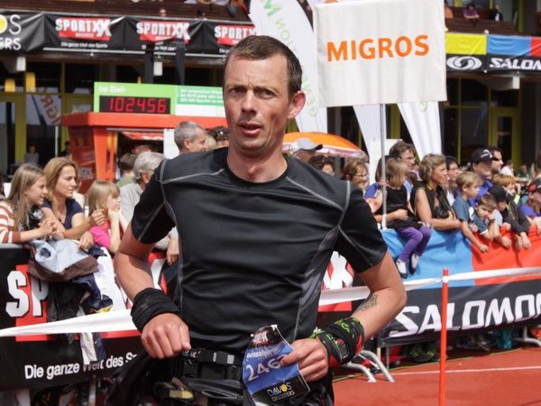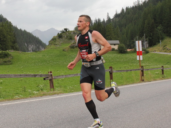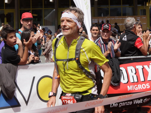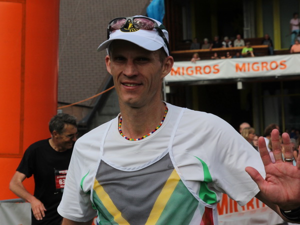 Erst bei Clavadel (1664 m, 36 km) wird das Geläuf besser, die letzten Kilometer werden auf einen guten Forststraße mit nur leichtem Gefälle bequem und einigermaßen locker gelaufen. Vor uns und noch etwas unterhalb liegt Davos. Bald ist vom Sportzentrum her schon der Sprecher zu hören. Freude und Genuss kehren zurück, trotz neuerlichem Regen, trotz bedrohlich klingendem Donner. Welch ein Empfang. Der K 42 hat mich mal wieder geschafft. Die Leute können brüllen, wie sie wollen. Ich marschiere. Erst auf der roten Rennbahn im Stadion beginne ich zu laufen und die Atmosphäre zu genießen. Wieder so ein Lauf, wieder so ein Abenteuer und eine Erfahrung, die man nur macht, wenn man sich bei einer schlechten Wetterprognose nicht das Frühstück auf’s Zimmer bringen lässt.