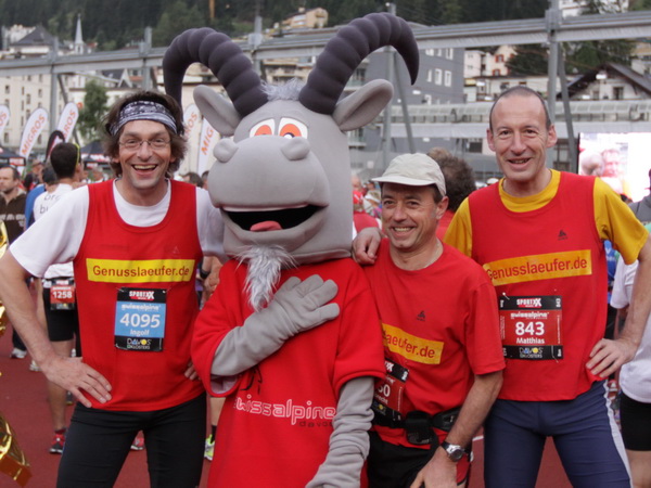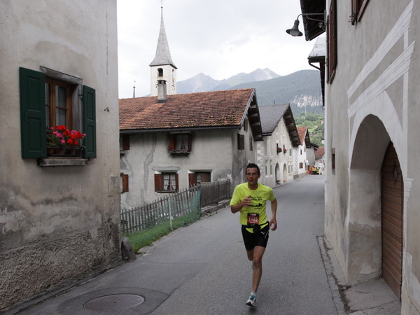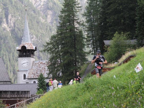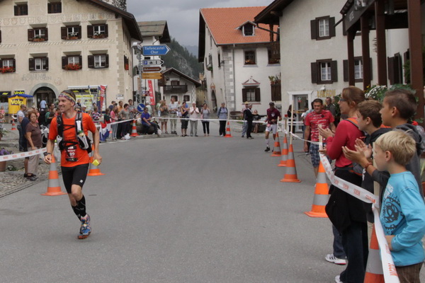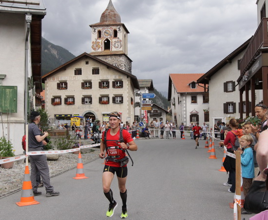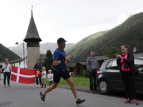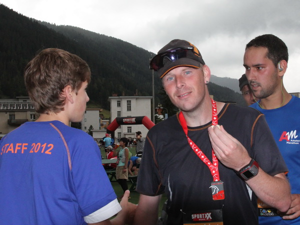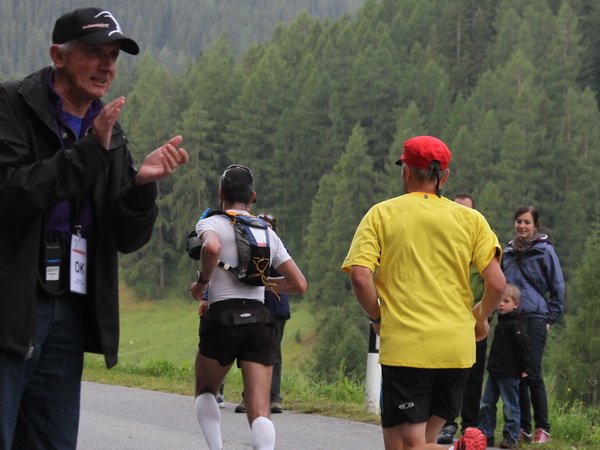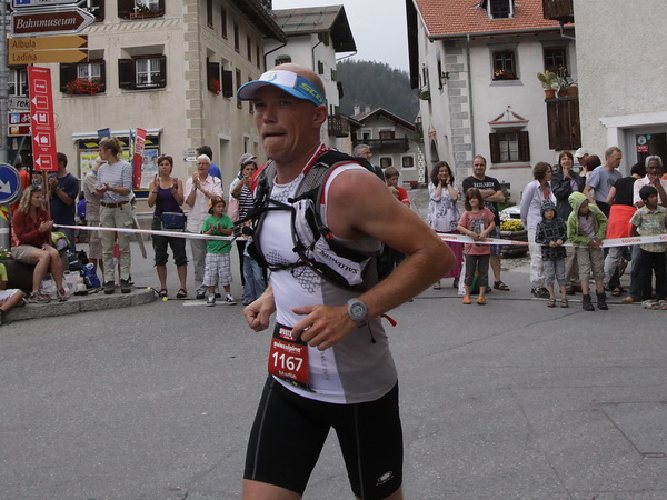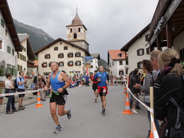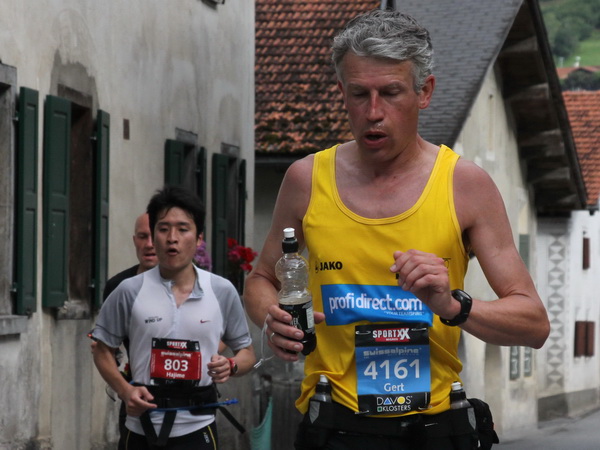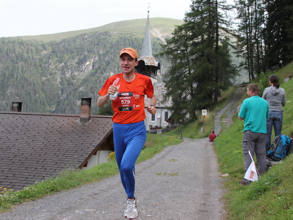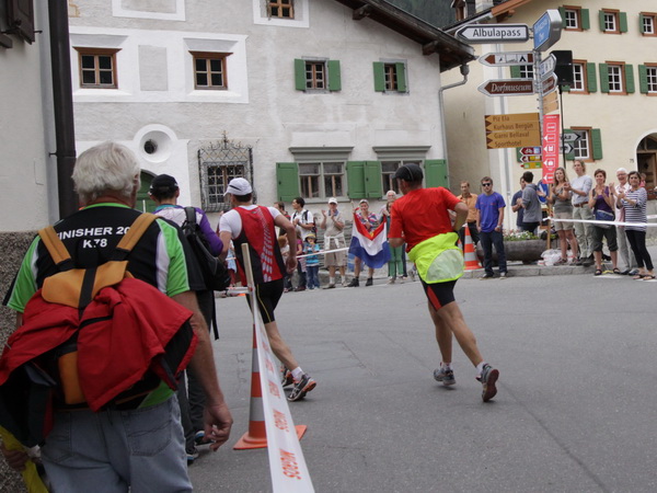 Auf die nächste menschliche Ansiedlung treffen wir erst wieder bei km 26 (Chüealpe, 2101 m). Danach wird der Weg besser und kommt einem trotz Matsch sehr komfortabel vor. Richtige Zivilisation erreichen wir bei Sertig Dörfli (1861 m, 29 km). Ab hier verkehren Busse, bringen Zuschauer hin und erschöpfte Alpines zurück.