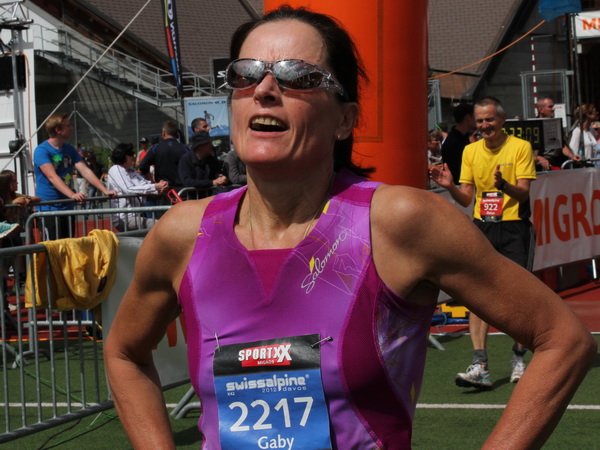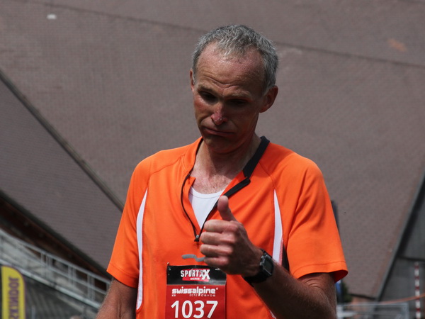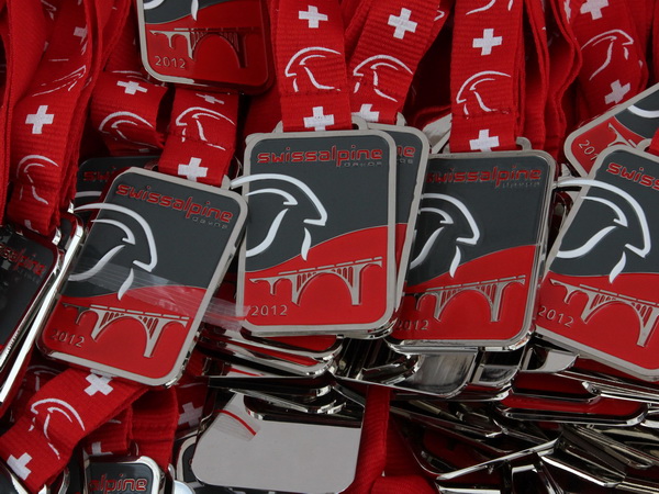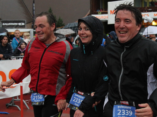 Trotz diverser Regengüsse unterwegs – so richtig durch und durch nass werde ich erst, als ich mit der Medaille um den Hals in aller Seelenruhe bei Blitz und Donner und strömenden Regen mir den Kleiderbeutel abhole. Und da ist mir alles so was von egal … Ich habe gefinisht. Nicht irgendeinen Kirmeslauf, den Swissalpine!