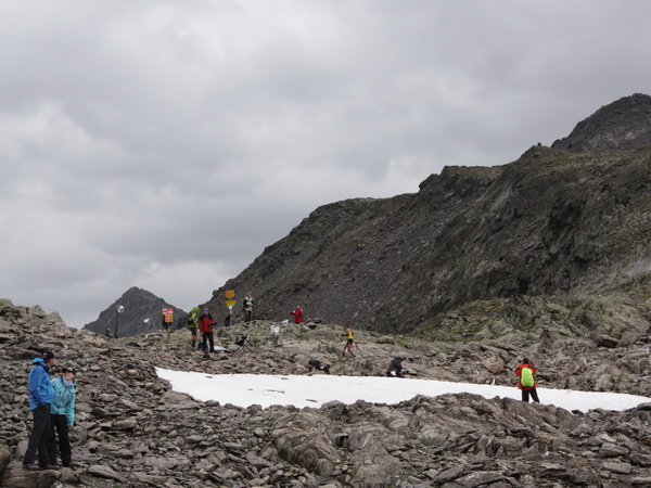 Bis hierhin unterschreibe ich blind, dass die Sertig-Variante die schönere Strecke ist. Was aber dann kommt, ist fürchterlich. Bekanntlich war die Strecke ja für schlechtes Wetter gedacht. Für richtig schlechtes, nicht so wie letztes und wie dieses Jahr. Nicht, dass die Wege über den Sertigpass dann besser zu laufen wären. Nein, man ist nicht so lange auf der Höhe. Nicht so lange auf der Höhe heißt, man ist schneller wieder unten. Das wiederum heißt, es geht steil abwärts. In diesem Fall heißt das sogar SEHR steil und das nicht mal kurz, sondern lang. So lang, dass ausgewachsene Alpines abwärts schon mal Gehpause machen. Der Weg über die Felsbrocken und spiegelglatten Schneefelder ganz oben ist dabei nicht gemeint.