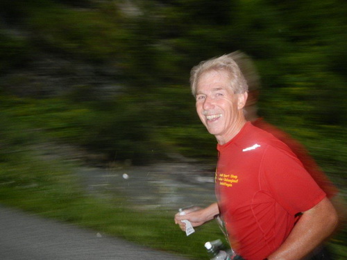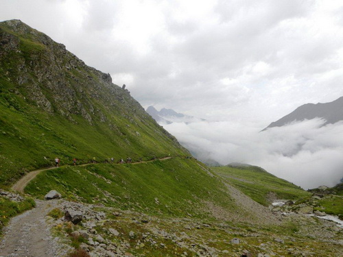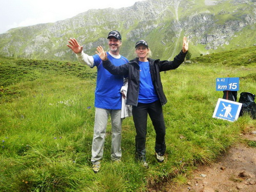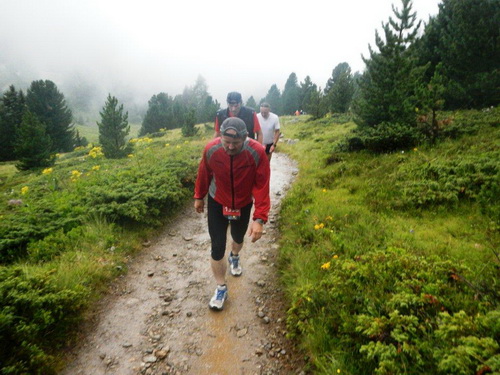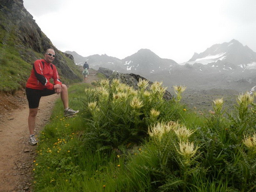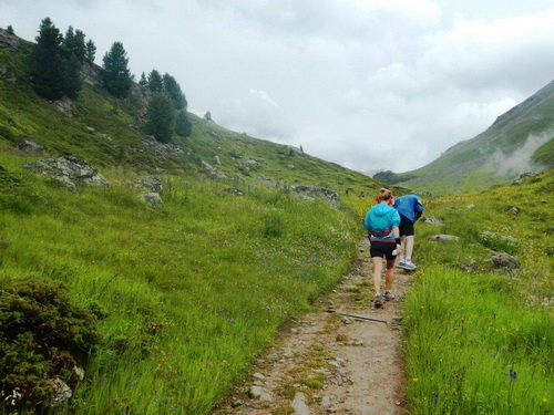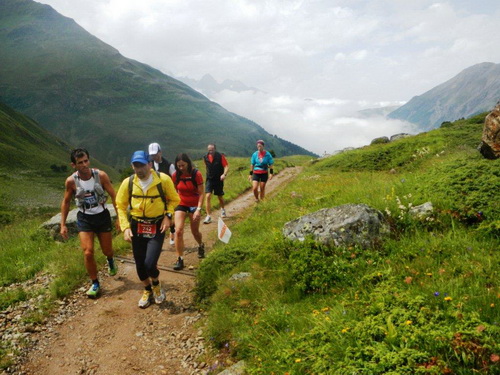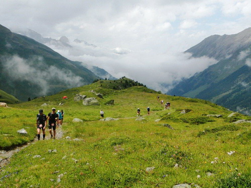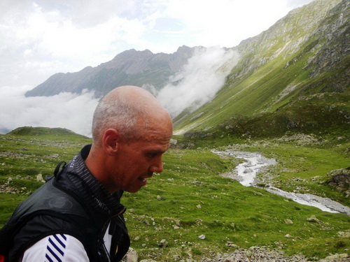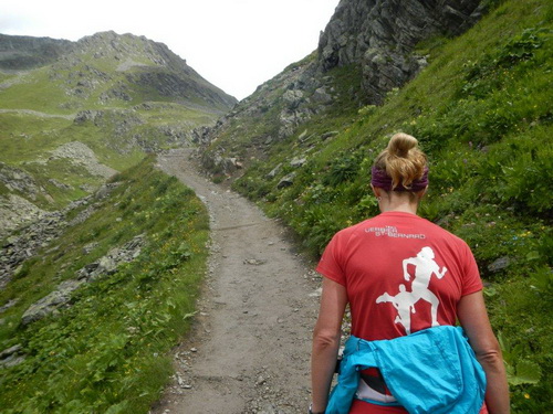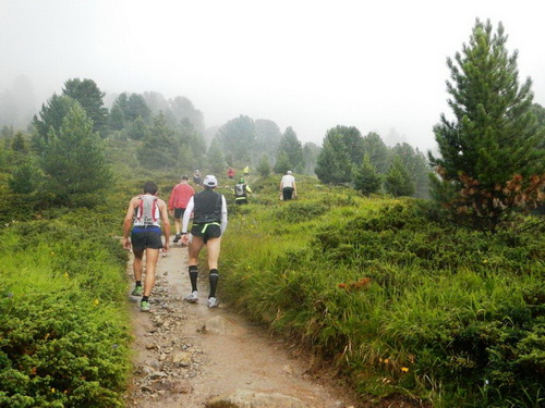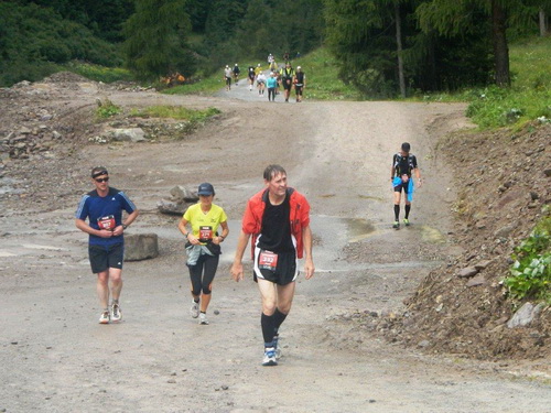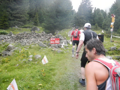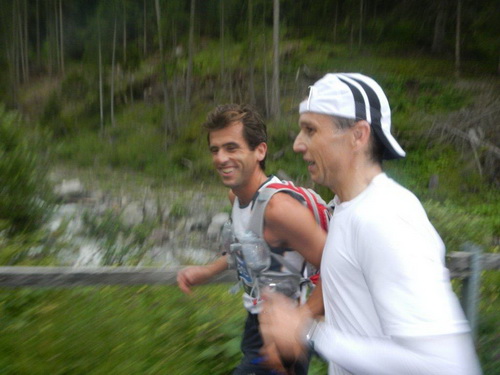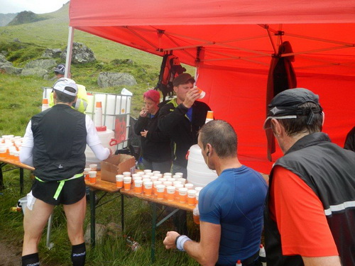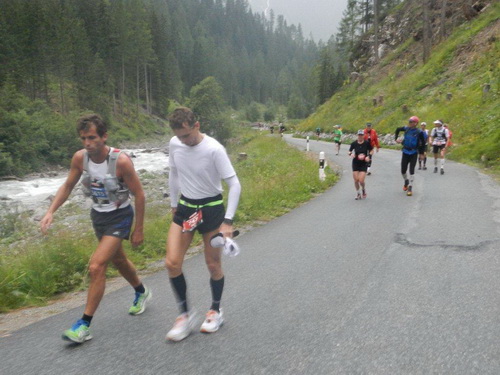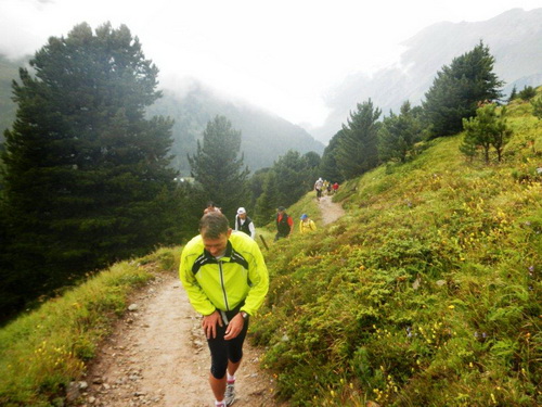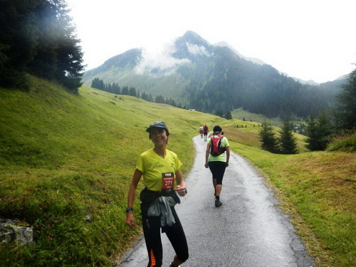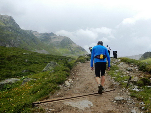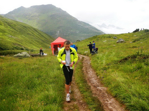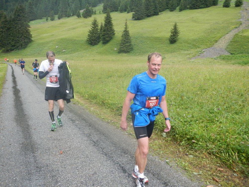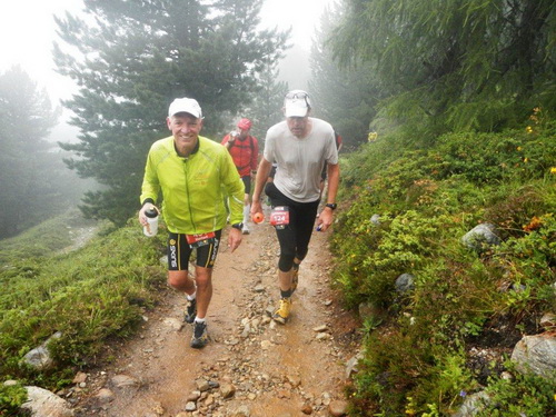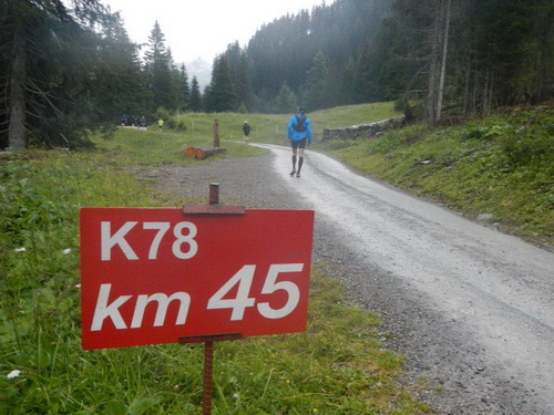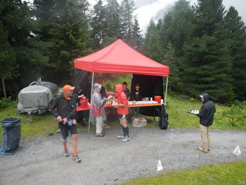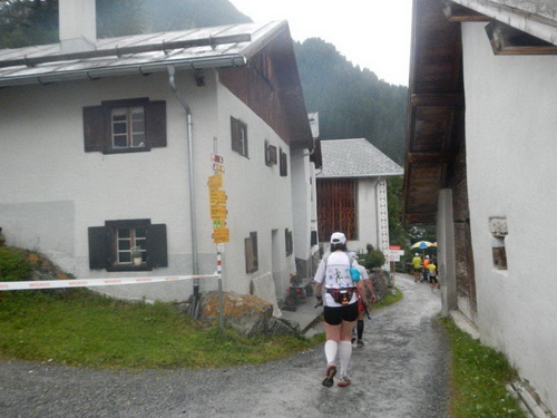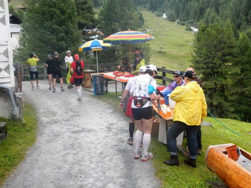 Mit der Mischung aus Sonnenschutz (ich bin Optimist), Schweiß und Regen in den Augen erkenne ich erst gar nicht, wer mir weiter vorne zuwinkt. Es ist Klaus auf dem K42, statt in leuchtendes Orange in eine schwarze Regenjacke gekleidet. Es ist selten, dass wir uns auf der Strecke treffen, also bleiben wir für ein Stückchen zusammen. Den ersten Teil des steilen Anstiegs hinter Chants legen wir miteinander zurück, dann, beim nächsten Verpflegungsposten Valzana verabschiede ich mich und stürme los.