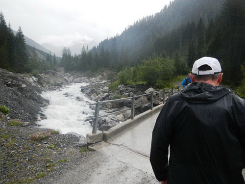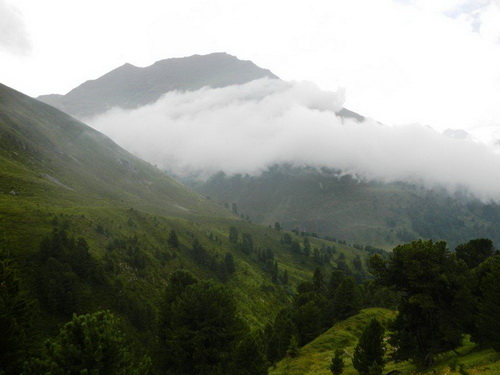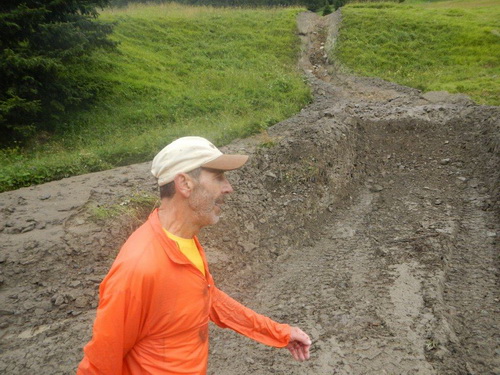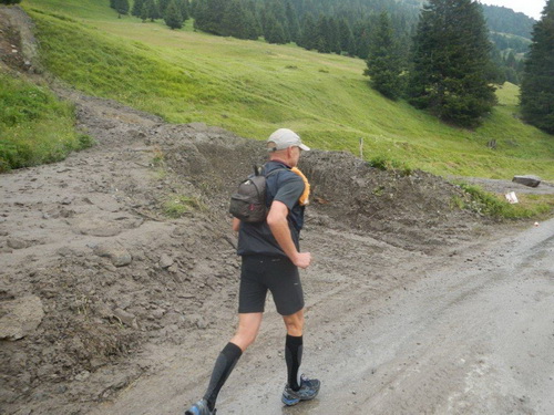 Ohne übersinnliche Erklärungen kommt der Streckenposten aus, welcher mir wenig später erklärt, weshalb wir auf der Albulastraße nach Bergün weiterlaufen und nicht auf der linken Talseite wie der Streckenplan vorsah. Die Ursache kam schon vom Himmel her, bewirkte aber ganz Irdisches: Das vorabendliche Gewitter hat den Weg im gröberen Stil unpassierbar gemacht. So ist das halt in den Bergen. Natural Running eben. Ich bin ehrlich und gestehe, dass ich dem mit ordentlich zusätzlichen Höhenmetern gepfefferten originalen Streckenverlauf in dem Moment nicht nachtraure. Es kommt wie es muss. Und es kommt ein erster Spritzer Regen.