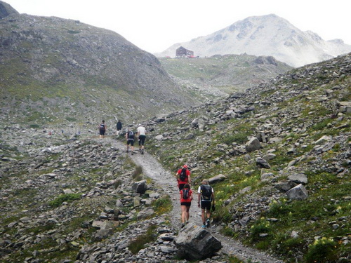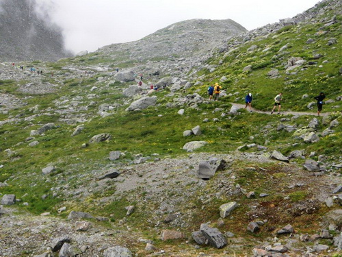 Ja und nein. Mich nervt, dass unweit der Keschütte die ersten dieser orangen Pelerinen am Wegrand liegen. Immerhin mit Steinen beschwert, damit der Wind sie nicht einfach wegträgt. Wie schwer trägt man denn bis zum nächsten Abfallsack an diesem Stückchen Plastik? Ins gleiche Kapitel gehören die Saubären, die es nicht schaffen, ihre leeren Geltüten, und was da an Wundermittelchen sonst noch mitgeführt wird, bis zur nächsten Entsorgungsmöglichkeit einzustecken. Unappetitlich verschwitzt und klebrig sind wir in diesem Moment alle, da kann man sich zur Not einen solchen leeren Beutel auch in die Hose stecken.
