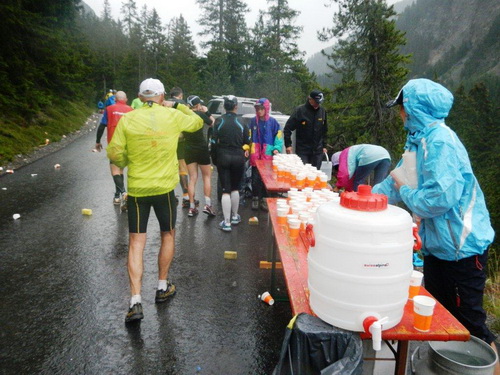 Im Gepäckdepot in Bergün habe ich nichts hinterlegen lassen, kann also ohne abzubiegen direkt zum Verpflegungsstand und mir die Alpine-Brötchen schmecken lassen. Es zieht mich aber schnell weiter, denn es ist deutlich, dass jeder jetzt verlorene Schritt einer mehr im Regen sein wird. Das Licht über dem Dorf wirkt apokalyptisch. Im Gegensatz dazu herrscht an der Strecke ein buntes und freudiges Anfeuern. Schon vor dem Unterqueren der Bahnlinie klatschen die ersten heftigen Tropfen auf den Boden, eine erste Kostprobe dessen, was mich im Val Tuors begleiten wird. Die Kamera signalisiert, dass es für ihren Job viel zu dunkel ist. Dass ich bereits triefe, stört mich nicht. Es gab schon mehrere Laufanlässe in diesem Jahr, welche meine diesbezügliche Evolution vorangetrieben haben. Solange noch keine Bürzeldrüse heranwächst… Natural Running eben.