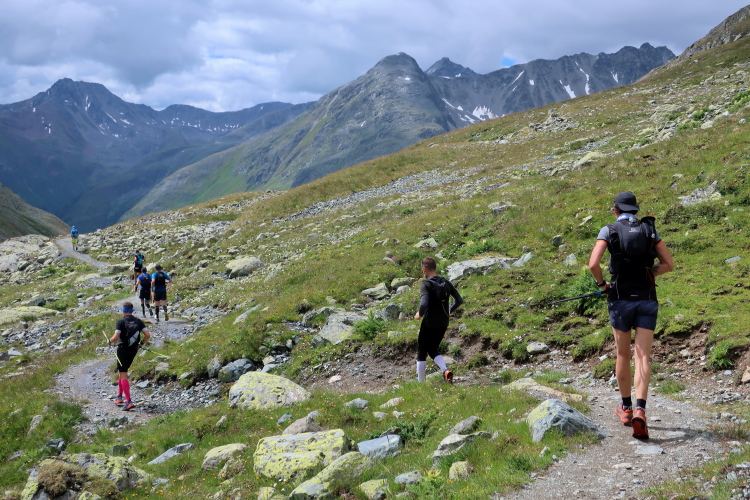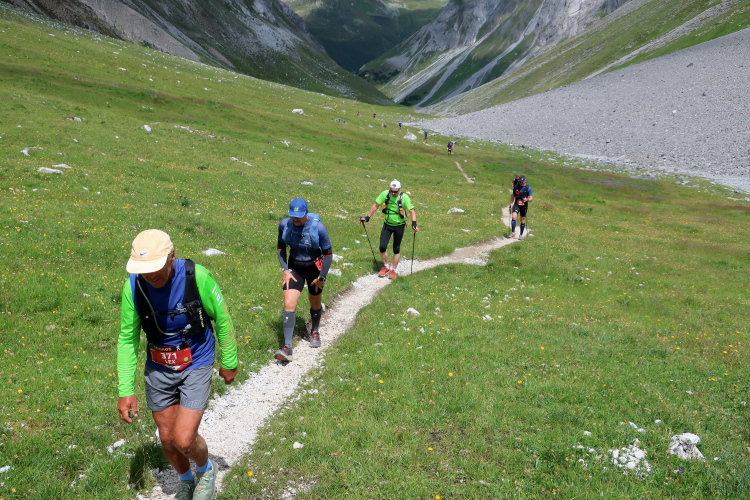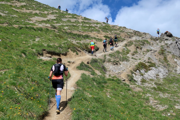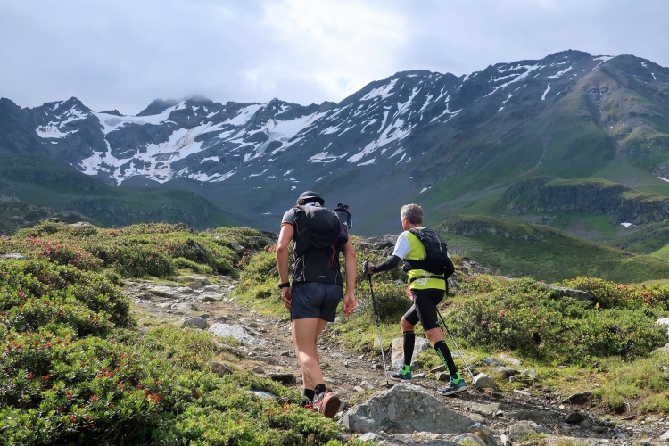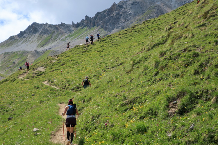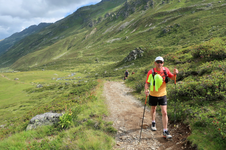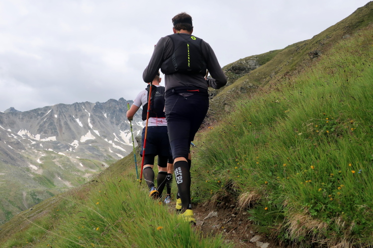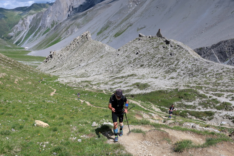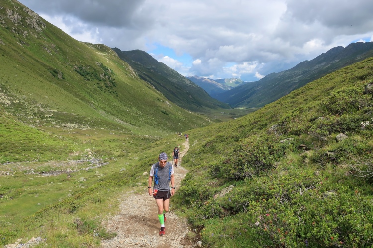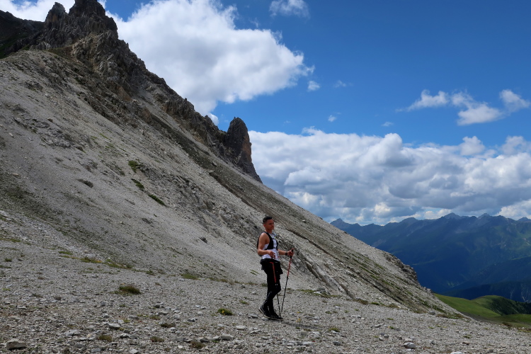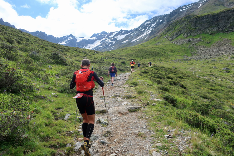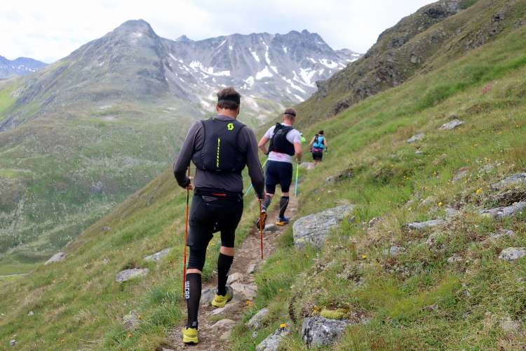 In langgezogenen Serpentinen zieht sich der Weg schließlich immer weiter und unerbittlich in die Höhe. Das Klackern der Laufstöcke ist meist das einzige Geräusch, das durch die Stille der einsamen Berglandschaft dringt. Aber noch sind die meisten Läufer frisch und motiviert und so geht es zumeist flotten Marschierschrittes voran. Das am Horizont in der Gipfelregion zunächst so düstere Wolkengebälk lichtet sich und gibt den Blick frei auf die Berge um und über uns. Nur die Sonne tut sich noch schwer durchzudringen.