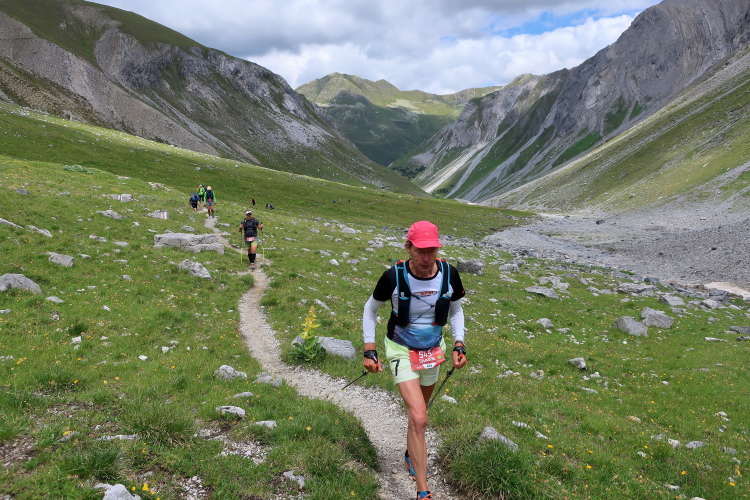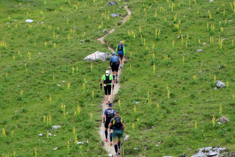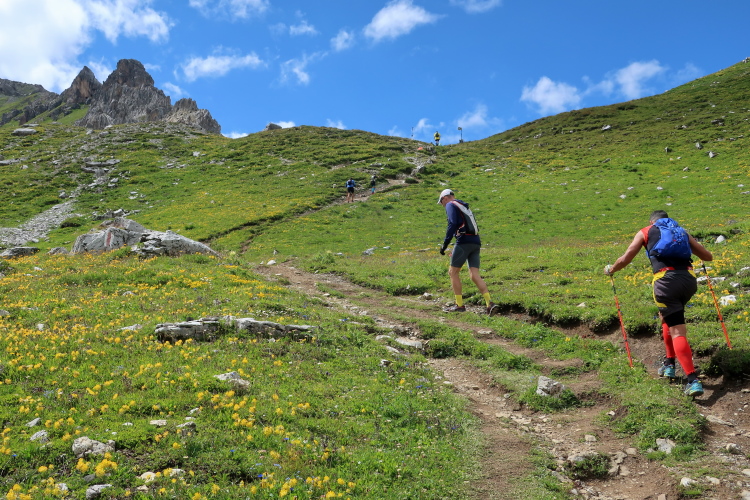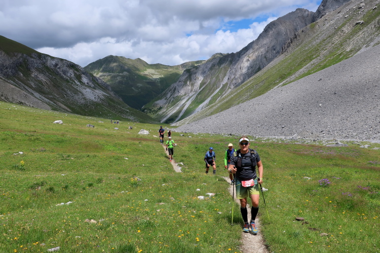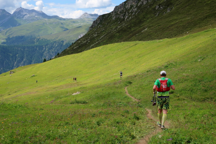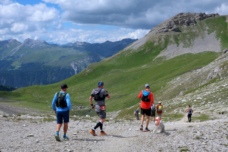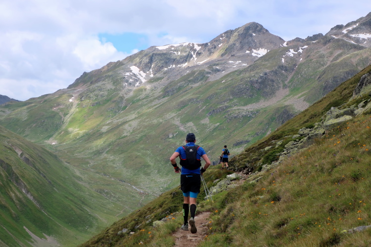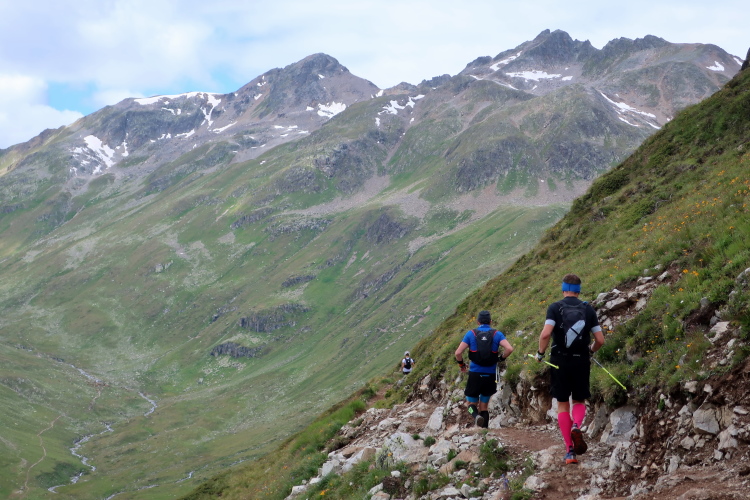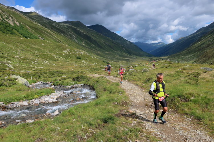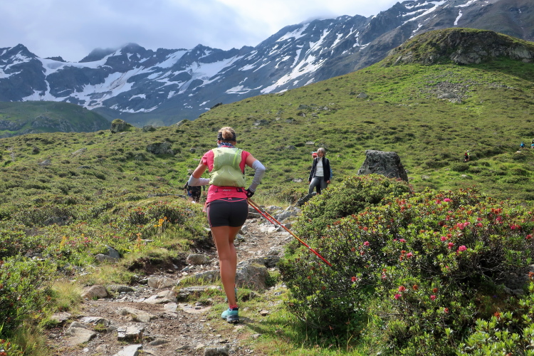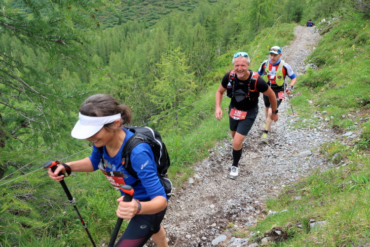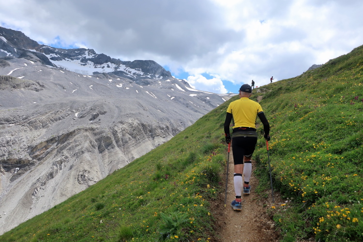 In langgezogenen Serpentinen zieht sich der Weg schließlich immer weiter und unerbittlich in die Höhe. Das Klackern der Laufstöcke ist meist das einzige Geräusch, das durch die Stille der einsamen Berglandschaft dringt. Aber noch sind die meisten Läufer frisch und motiviert und so geht es zumeist flotten Marschierschrittes voran. Das am Horizont in der Gipfelregion zunächst so düstere Wolkengebälk lichtet sich und gibt den Blick frei auf die Berge um und über uns. Nur die Sonne tut sich noch schwer durchzudringen.
