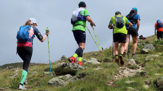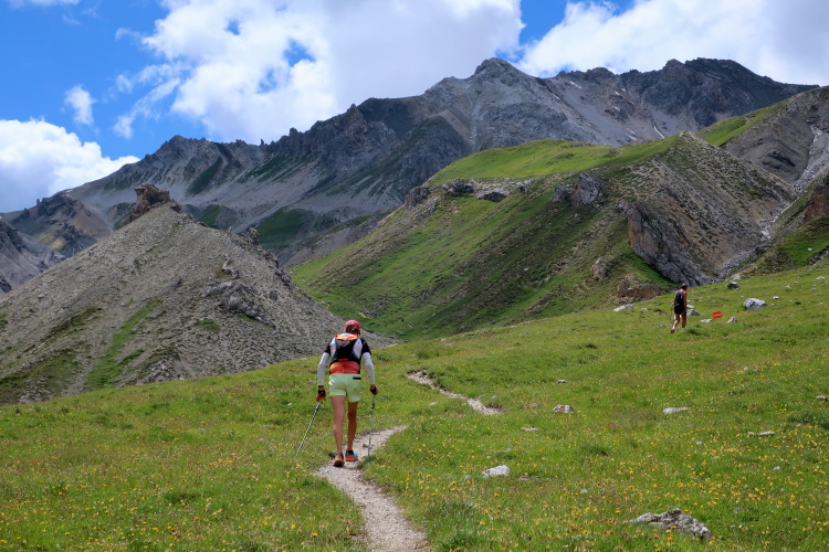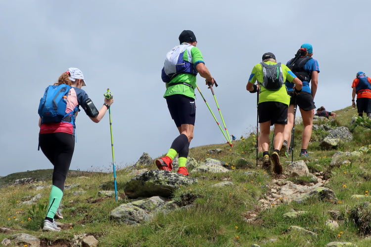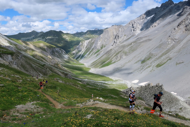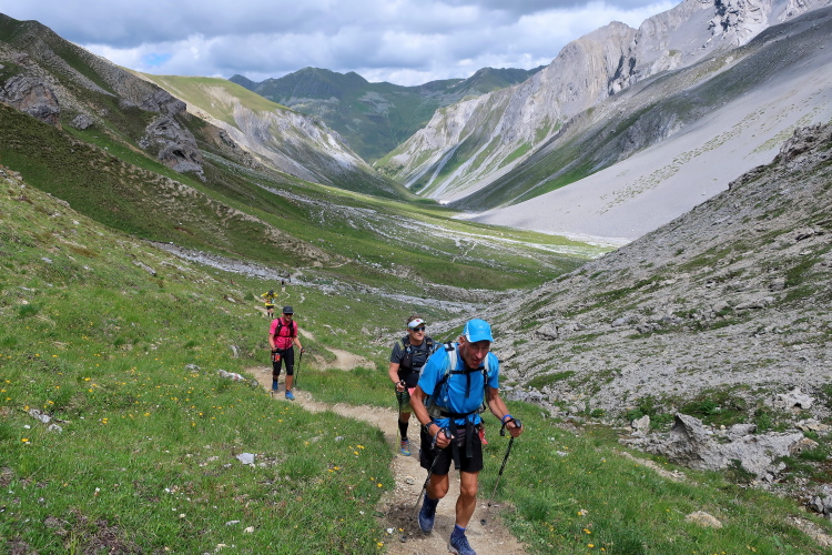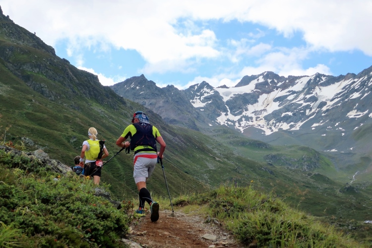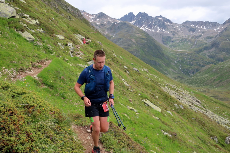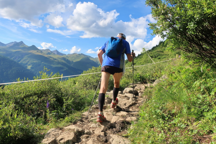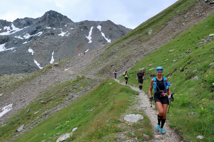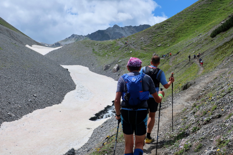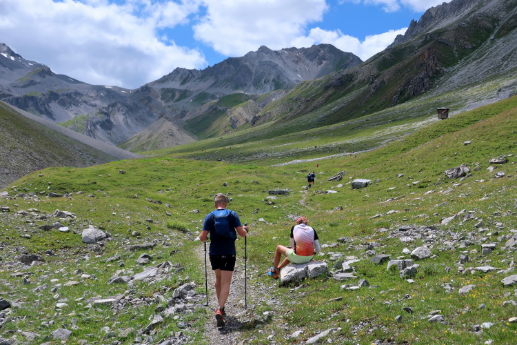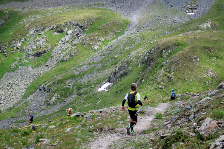 In langgezogenen Serpentinen zieht sich der Weg schließlich immer weiter und unerbittlich in die Höhe. Das Klackern der Laufstöcke ist meist das einzige Geräusch, das durch die Stille der einsamen Berglandschaft dringt. Aber noch sind die meisten Läufer frisch und motiviert und so geht es zumeist flotten Marschierschrittes voran. Das am Horizont in der Gipfelregion zunächst so düstere Wolkengebälk lichtet sich und gibt den Blick frei auf die Berge um und über uns. Nur die Sonne tut sich noch schwer durchzudringen.