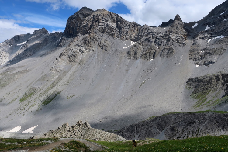 Als ich über mir ein paar einsame Gestalten an der Grenze zwischen Himmel und Fels verharren sehe, weiß ich: die Passhöhe ist nicht mehr fern. Es ist ein erhabenes Gefühl, nach 18 km auf einmal den kalten Hauch des Windes zu spüren, wie er über die Kante des 2.606 m hohen Scalettapass bläst, und den Blick auf das zu richten, was hinter mir liegt, mehr noch aber auf das, was sich jenseits des Passes vor meinen Augen auftut. Und das ist nochmals um einiges eindrucksvoller.