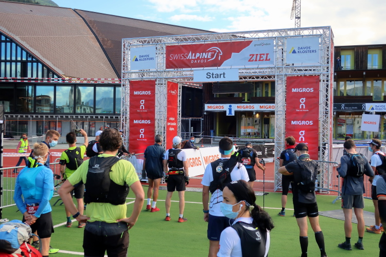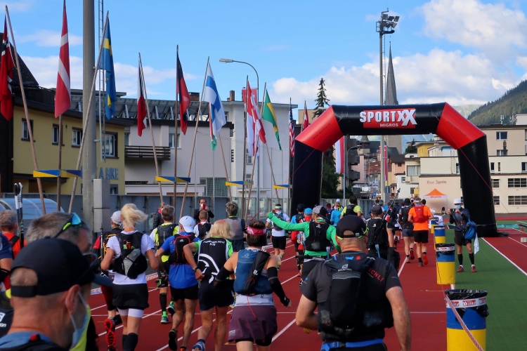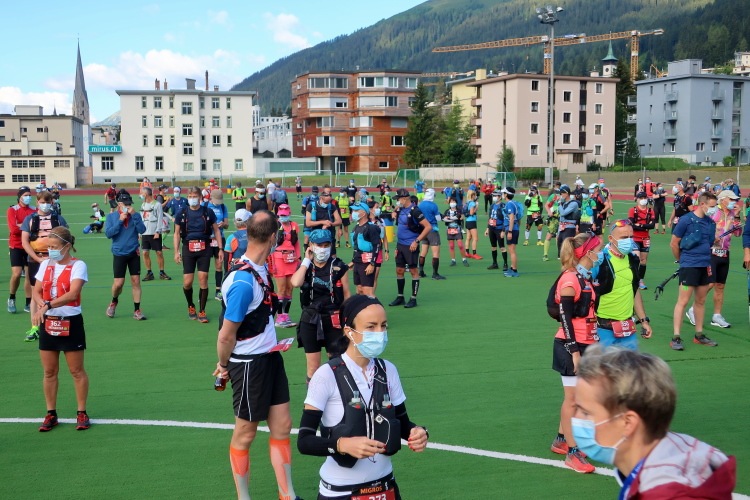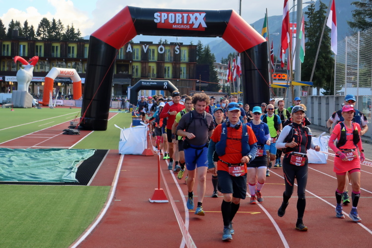 Dann endlich, zu den Klängen der Vangelis-Hymne „Conquest of Paradise“ ertönt der nächste Schuss aus der Startpistole und bringt auch mich um 8:30 Uhr auf Trab. Im Startkanal durch das Stadion verdichtet sich naturgemäß der Läuferstrom. Erleichtert darf ich mir kurz vor dem Stadionausgang meine Schutzmaske vom Gesicht ziehen und in eine der bereit gestellten Tonnen werfen. Deutlich entspannter geht es weiter hinaus auf die Talstraße und in einer Schleife über die Landwasser hinweg, zunächst noch auf Asphalt, direkt unserem ersten Ziel entgegen: dem Dischmatal. 13 Stunden bzw. bis 21:30 Uhr habe ich nun Zeit, den Weg zurück nach Davos zu finden. Aber ungewiss ist für mich, ob mir das heute gelingen wird.