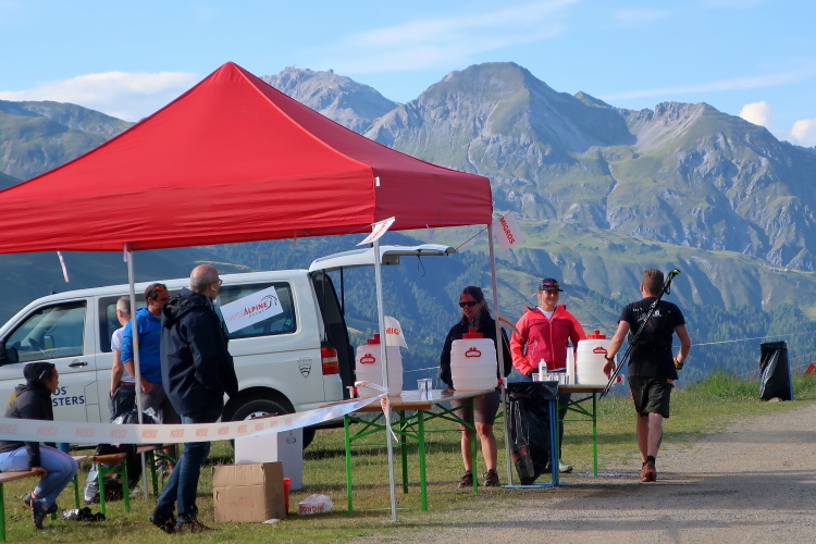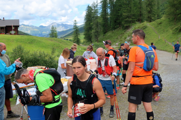 Zurück in der „Zivilisation“, das zumindest verheißt die wie ein Fremdkörper einsam im offenen Hang stehende Bergstation der Rinerhornbahn. Aber kein Mensch ist zu sehen, auch als ich kurz darauf nach 49 km das in traumhafter Panoramalage auf 2.053 m gelegene Bergrestaurant Jatzmeder erreiche. Menschen erblicke ich erst kurz dahinter, an der hier postierten Verpflegungsstelle.