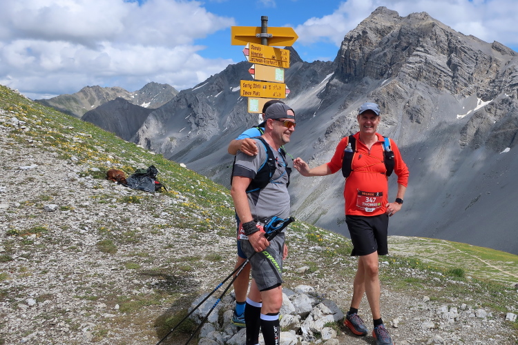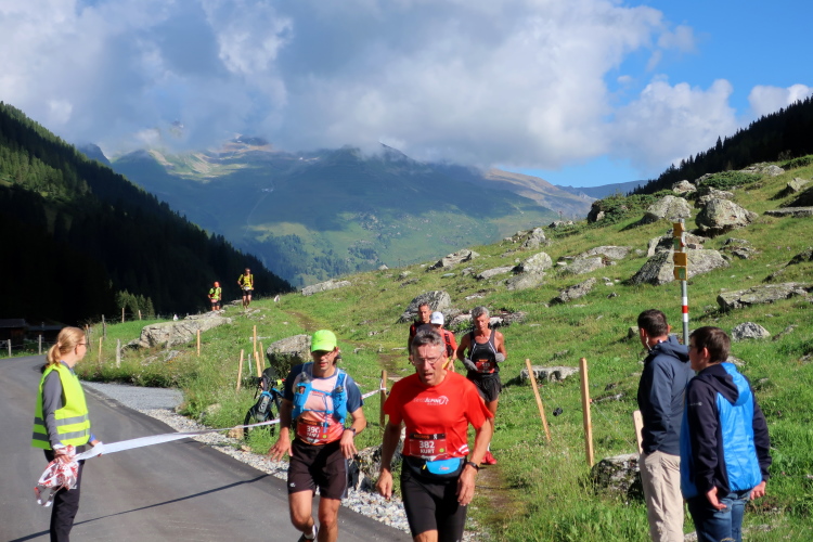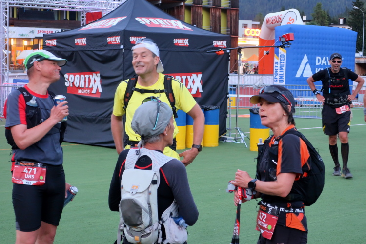 Am sogenannten Walserhuus in Sertig Sand ist nach 56 km der letzte größere Verpflegungsstopp und die letzte Zwischenzeitmessung vorgesehen. Quasi durch die Hintertür führt der Pfad in den Weiler hinein. Schon aus der Entfernung sehe ich, die Verpflegungspavillons sind geschlossen. Die Zwischenzeit wird hier nicht mehr genommen, aber ich werde von einer freundlichen Schar von Leuten gleich in Empfang genommen und offiziell über das informiert, was mir ohnehin klar ist: Für mich geht es hier nicht mehr weiter, die Cut Off-Zeit ist überschritten. Ich bin mehr erleichtert als betrübt darüber.