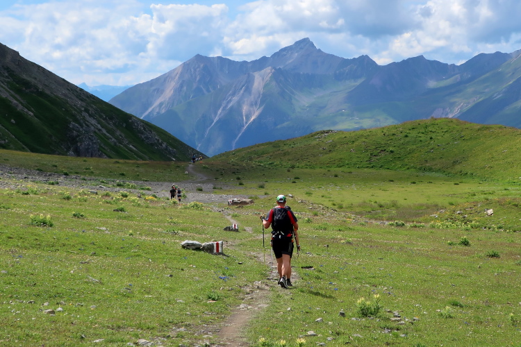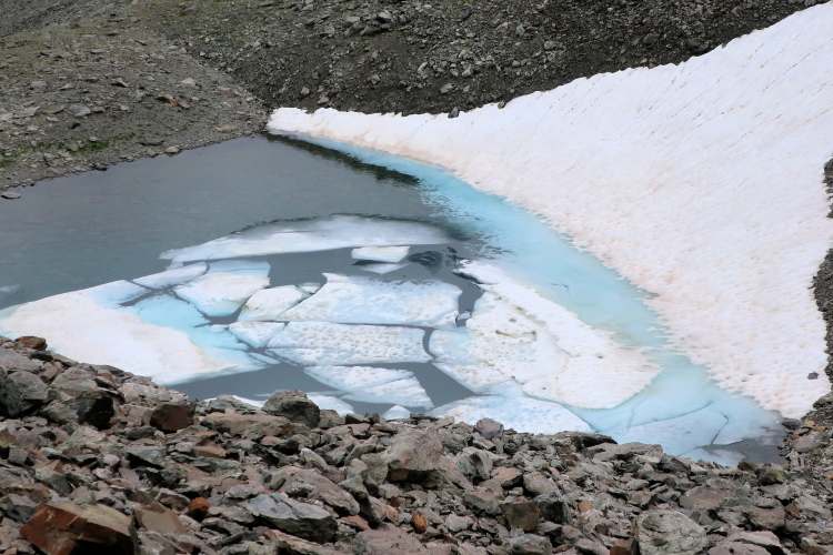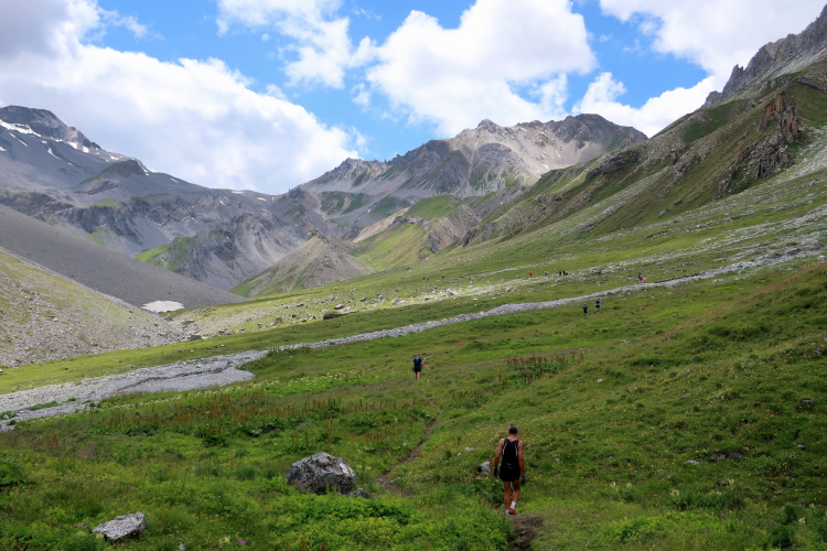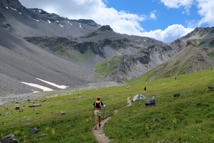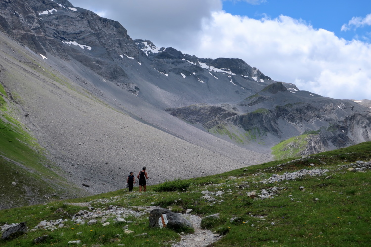Wie ein kleiner Gletscher wirkt das sich im sonnengeschützten Talgrund hinziehende Schneeband, aus dessen unterem Ende geräuschvoll der Ducanbach tritt. Mehr denn je erlebe ich hier Hochgebirgsfeeling. Ein Stück weit setzt sich der ausgesetzte Pfad noch fort, bis wir unvermittelt in ein weites grünes Hochtal treten, durch den sich der Weg nurmehr leicht ansteigend fortsetzt. Ebenso unvermittelt ändert sich die Geräuschkulisse: Es ist auf einmal ungemein still.