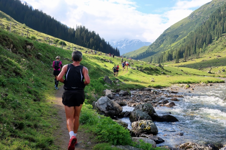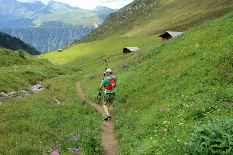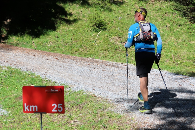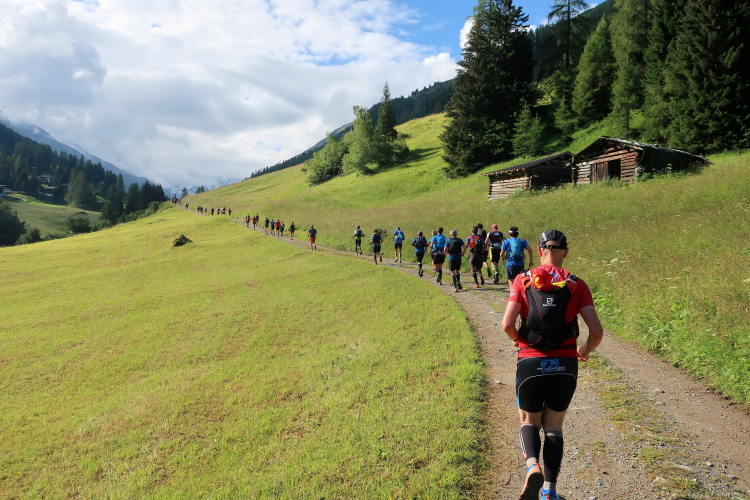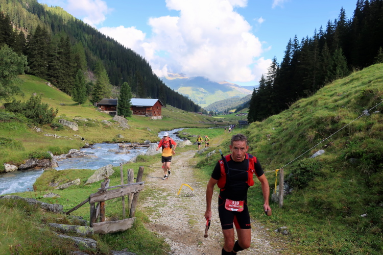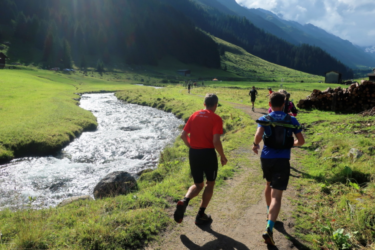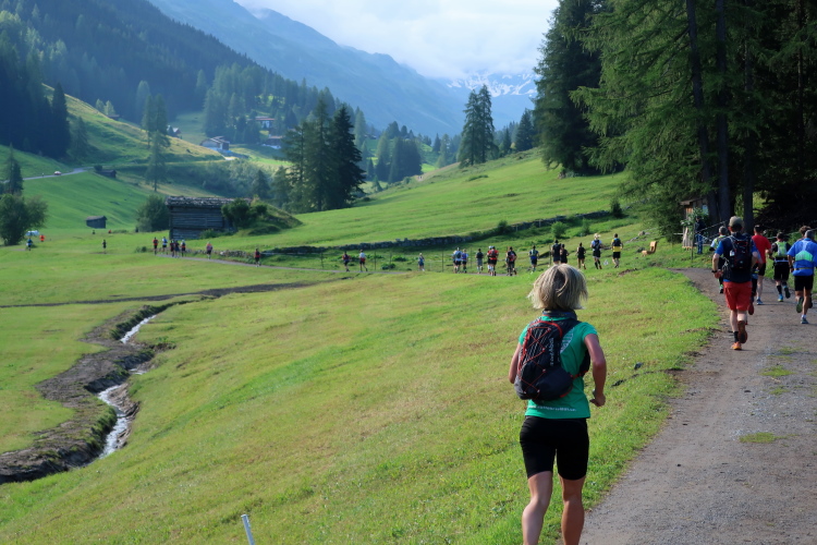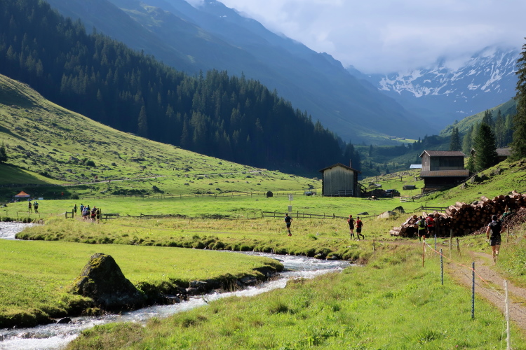 Sozusagen eine vollautomatische Wasserstelle erwartet uns nach 29 km auf der Chüealp. Der munter sprudelnde Brunnen ist in unserem Verpflegungsplan extra vermerkt. Auch die nächsten Kilometer durch das mittlerweile sonnendurchflutete Tal können wir es laufen lassen. Die Sonnenwärme im windstillen Tal fordert allerdings nun reichlich Schweiß als Tribut. Die ersten, im sich weitenden Tal versprengten Gehöfte und Weiler werden sichtbar. Wenn man hier weiterlaufen würde – wie es die Starter des K43 tun – wäre demnächst das 1.861 m hoch gelegene Sertig Dörfli erreicht und würde der Weg direkt weiter nach Davos führen.