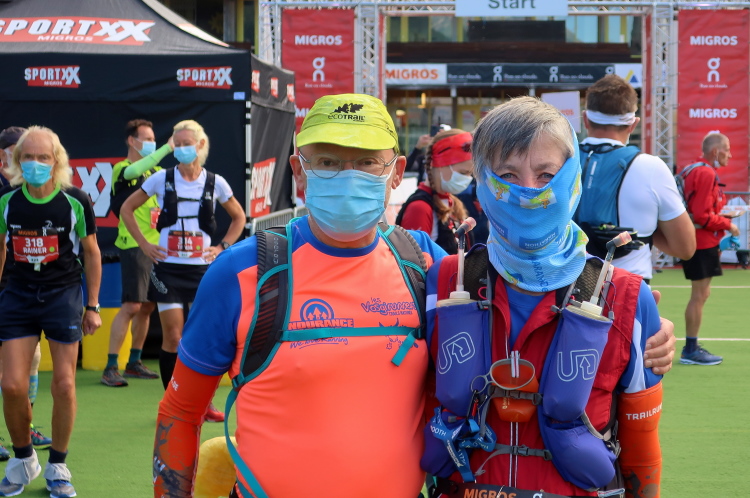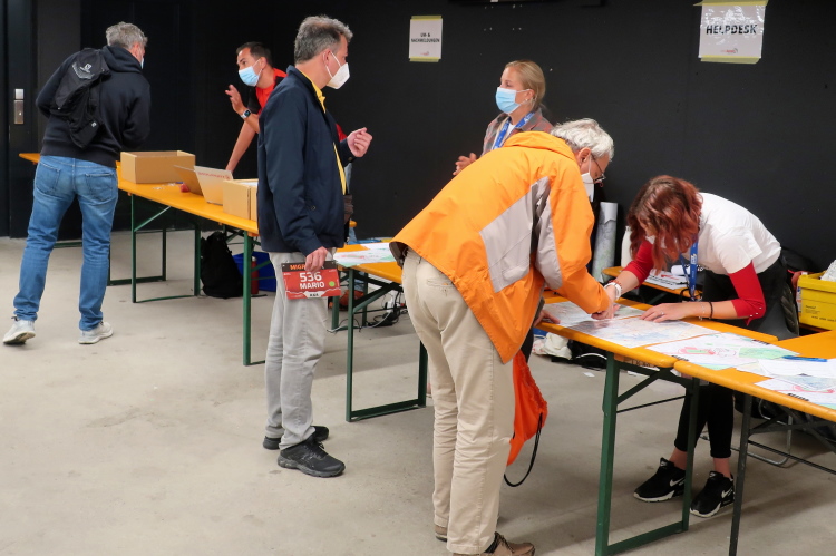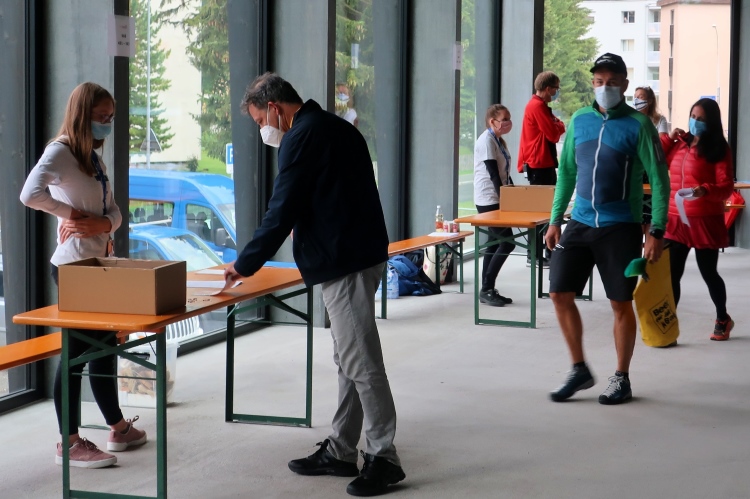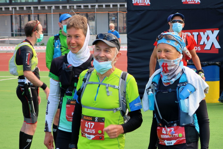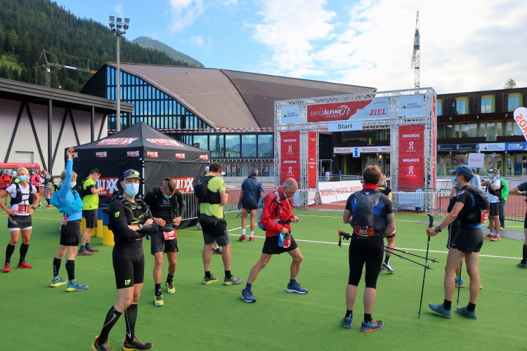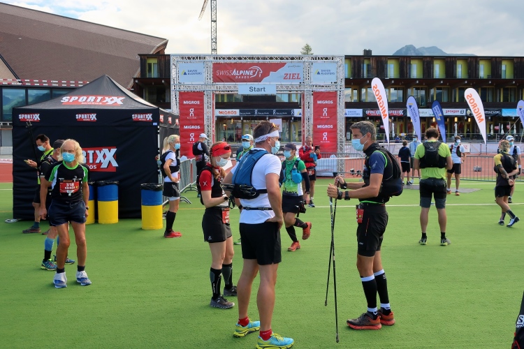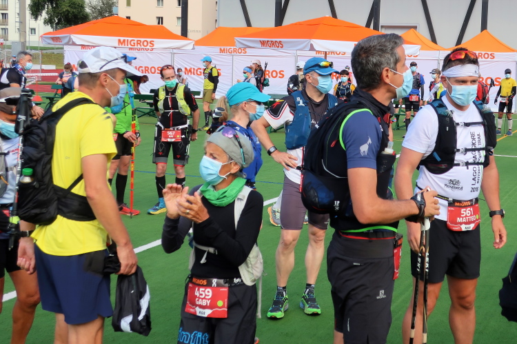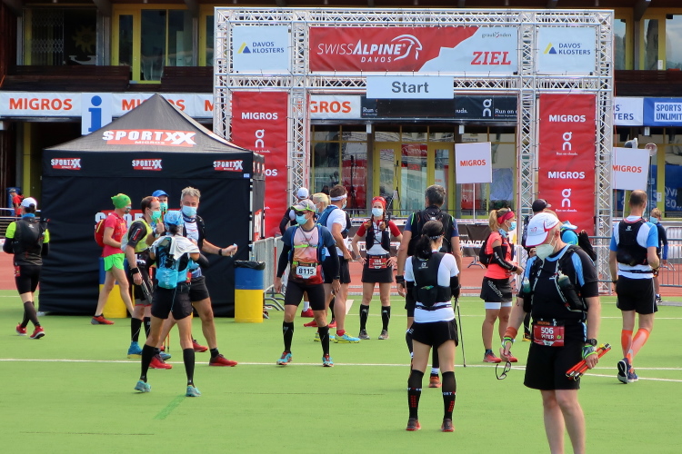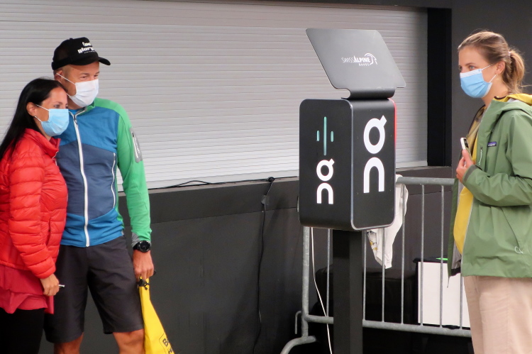 Im Ablauf gibt es klare Ansagen, wer sich wann und wo aufzuhalten hat. So gibt es zwei zeitversetzt startende Blöcke, die sich gleichfalls zeitversetzt nur in bestimmten Zonen aufhalten dürfen. Mit dem Block 2 darf ich ab 7:45 erst dann in die sogenannte Vorzone zur Gepäckabgabe, als die Starter des Blocks 1 diesen verlassen und in der Startzone regelkonform, das heißt Maske tragend und Mindestabstand einhaltend, Aufstellung genommen haben. Ein wenig seltsam mutet das schon an, aber das sind eben die Bedingungen, damit so etwas überhaupt stattfinden kann. Sehr anschaulich berichtete der scheidende OK-Chef Andrea Tuffli in der gestrigen Pressekonferenz von den schwierigen, aber letztlich erfolgreichen Verhandlungen mit den Kantonsbehörden.