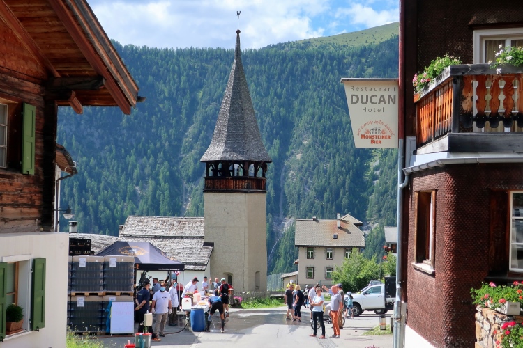 Das auf 1.626 m üNN hoch über dem Landwassertal gelegene Walserdorf Monstein kann auf eine lange Vergangenheit zurück blicken. Die inmitten wettergegerbter Holzhäuser thronende alte Dorfkirche mit ihrem regionaltypisch spitzhaubigen Kirchturm datiert immerhin aus dem Jahr 1668. Direkt davor endet der Weg hinab an einem Verpflegungsposten. Warm, ja richtiggehend heiß ist es hier „unten“ in der Nachmittagssonne. Hinter den Helfern aufgetürmte leere Bierträger erinnern daran, dass in Monstein sogar ein eigenes Bier gebraut wird. Mehr zum Spaß merke ich an, dass ein kühles Bier jetzt das eigentlich Wahre wäre. Worauf mir entgegnet wird, dass ich mir gerne einen Becher Bier zapfen könne. Wie? Was? Wo? Ich kann es kaum glauben: Hinter mir am Dorfplatz erhebt sich eine Säule in Gestalt eines Baumstammes mit einem künstlichen Hirschgeweih an der Seite – und das entpuppt sich als Zapfhahn, einfach so öffentlich zugänglich. Auch wenn ich mehr Schaum als Gerstensaft im Becher habe, das kühle Gold schmeckt einfach nur köstlich. Ich bleibe nicht der einzige bei der Verkostung und die Stimmung steigt rapide.