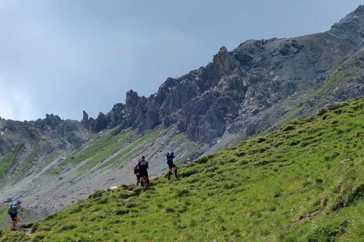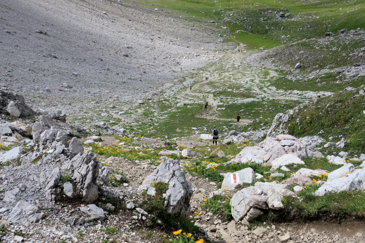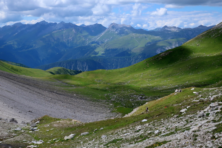 Immer weiter mäandert der Pfad durch das felsdurchsetzte Grün des Südhangs in die Höhe. Irgendwann ist es dann doch so weit. Ein paar verharrende Menschlein hoch oben im Hang sind ein untrügliches Zeichen, dass dort etwas ist, wofür es sich lohnt, stehen zu bleiben. Eine Welle der Erleichterung erfasst mich, als auch ich endlich den 2.580 m hohen Fanezfurgga und damit den dritten hohen Pass unseres Kurses überschreite. Ich bleibe etwas länger als die anderen, setze mich hin, gönne mir etwas Ruhe. Und auch im Nachhinein muss ich sagen: Es lohnt sich sehr, diesen Punkt nicht einfach nur zu überschreiten, sondern gerade dem Blick zurück ins Ducantal mehr Zeit und Raum zu geben.