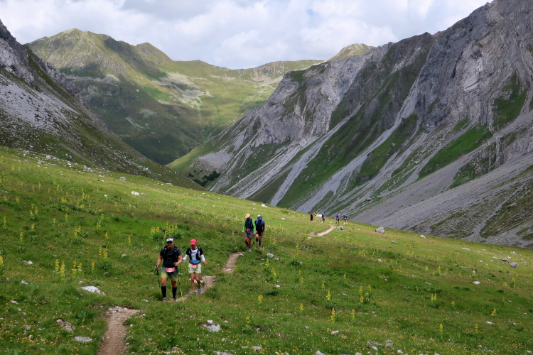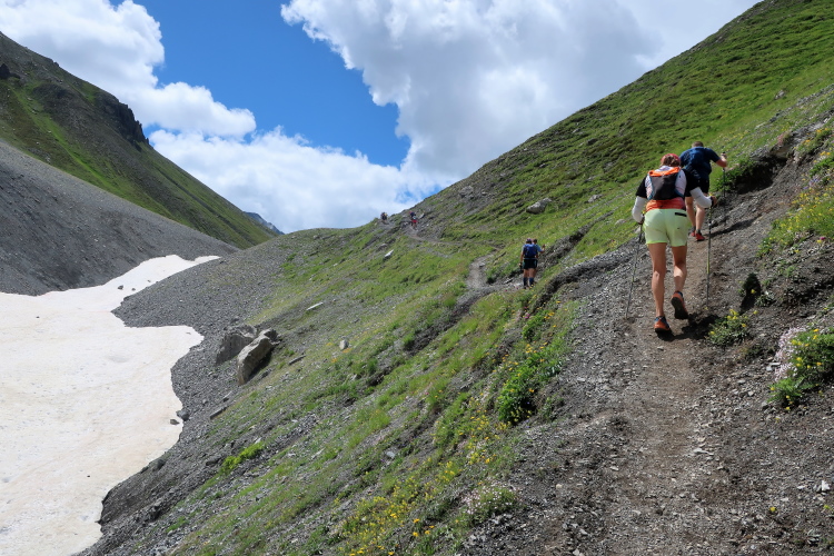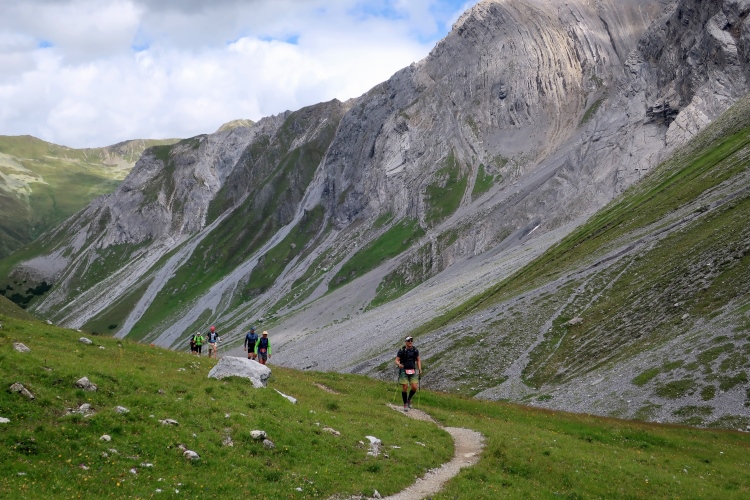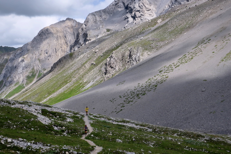 Zunehmend gewinnen wir entlang der Hangflanke an Höhe. Ich tue mir schwerer als meine Mitläufer und muss nach Luft japsend immer wieder innehalten. Immerhin bietet das eine willkommene Gelegenheit, Foto über Foto von der traumhaften Kulisse zu schießen – und Ihr (Leser) müsst das jetzt ausbaden. Immer wieder denke ich beim Blick nach oben: Ja, das schaut mir nach einem Übergang aus. Und jedes Mal werde ich enttäuscht, geht es immer noch weiter und höher hinaus. Für mich ist dies, auch im Nachhinein, das härteste Teilstück des alten wie neuen Streckenkurses. Und wie so oft liegen Himmel und Hölle nahe beieinander. Bei aller Mühsal sind die Ausblicke, die ich hier genießen darf, für mich die schönsten und imposantesten des gesamten Kurses.