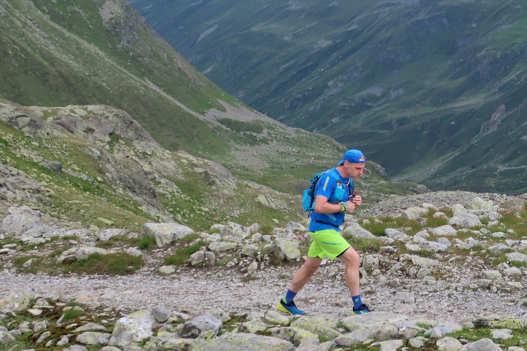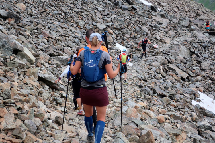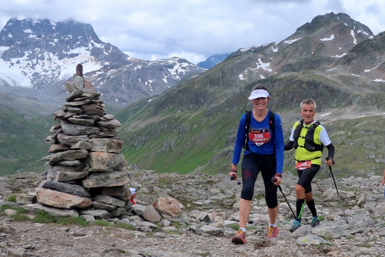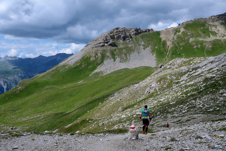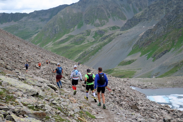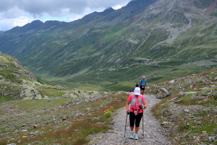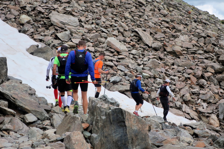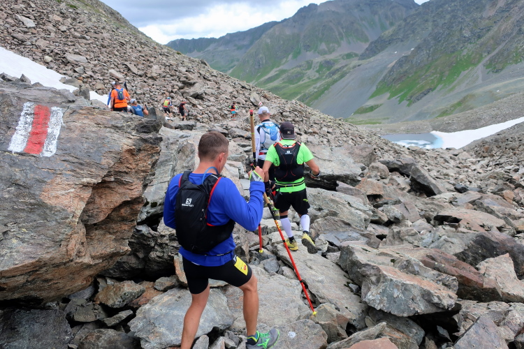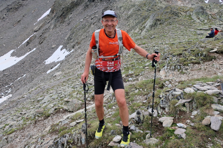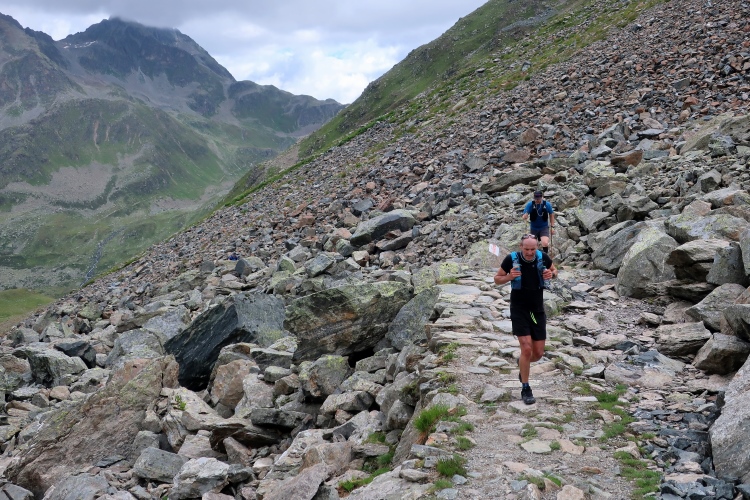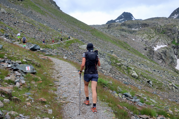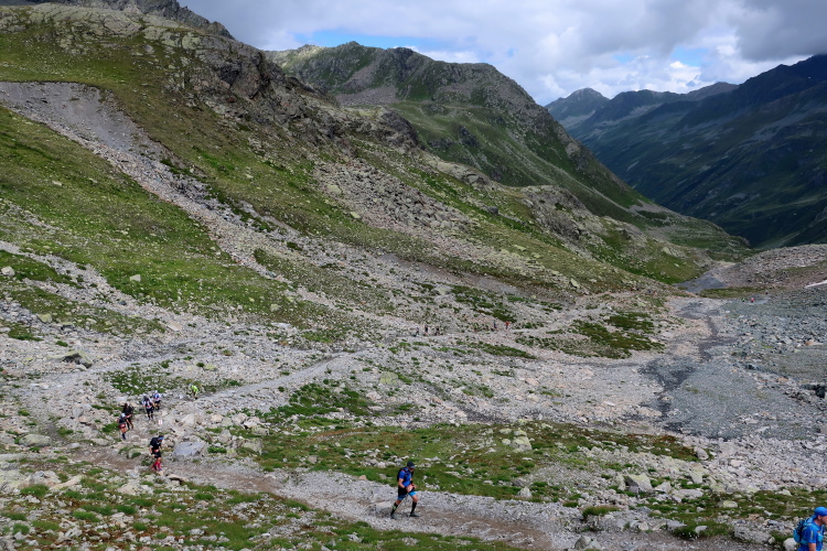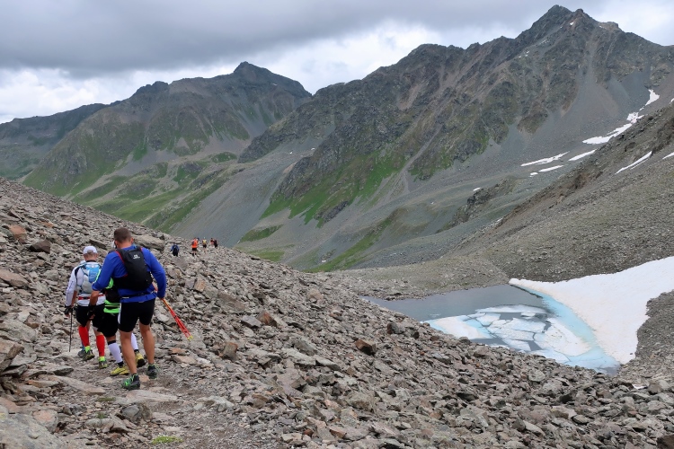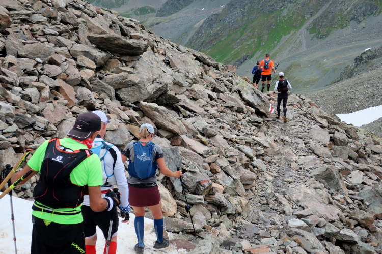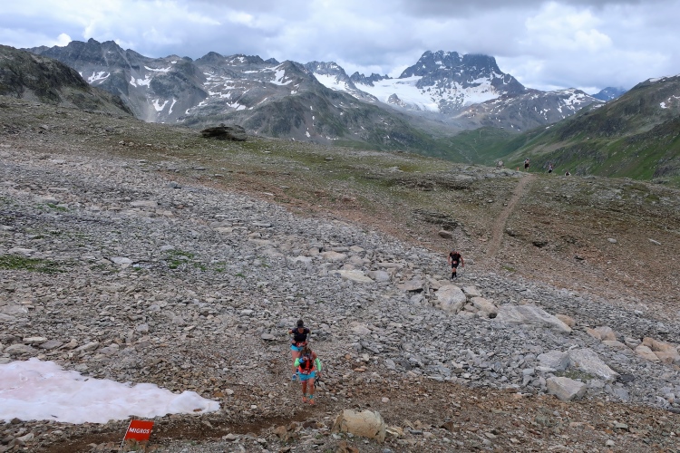 Ein Hubschrauber zieht laut knatternd seine Kreise. Ich denke, die winzigen bunten Läufergestalten in der weiten Bergwelt geben von da oben ein nettes Bild ab. Wobei das auch aus meiner Perspektive einen nachhaltigen Eindruck hinterlässt. Allmählich weicht dem Fels auch das letzte Grün. Durch blankes Geröll windet sich der Pfad schließlich unerbittlich dem höchsten Streckenpunkt entgegen. Ein Steinhaufen markiert diese Stelle auf 2.739 m üNN und zaubert bei fast jedem, der ihn erreicht, ein Lächeln ins Gesicht. Ohne ein Gipfelselfie zieht fast niemand von dannen.
