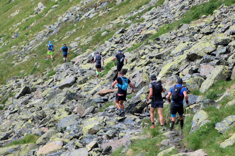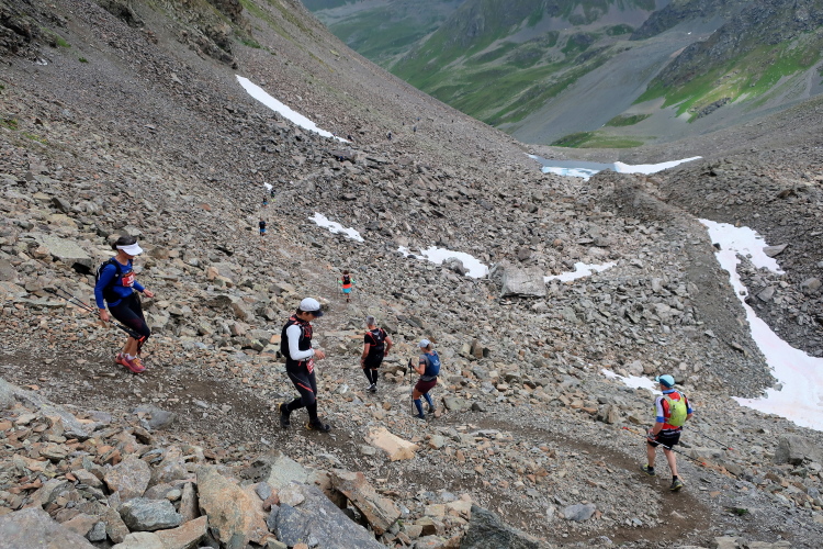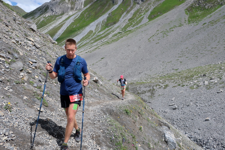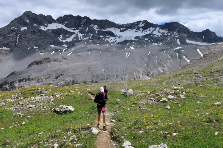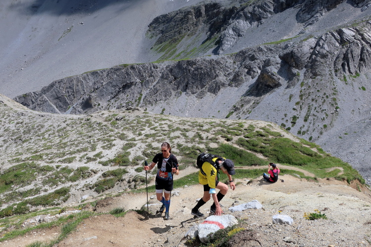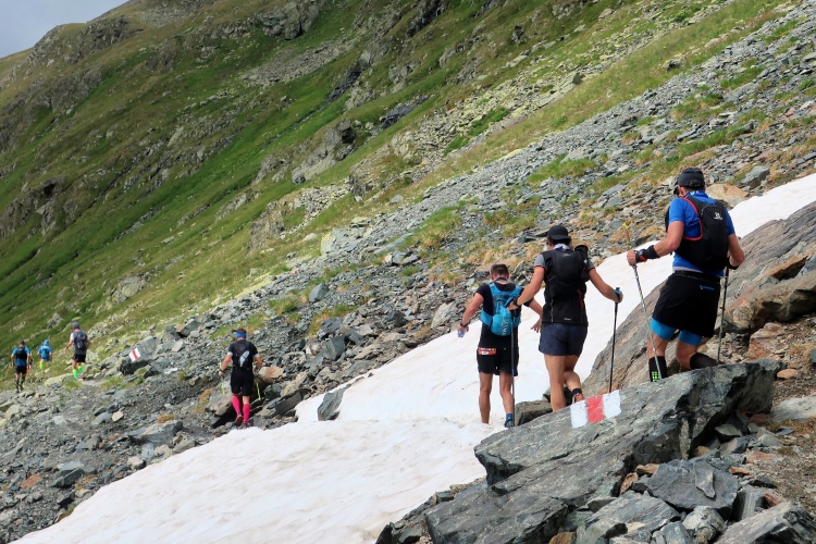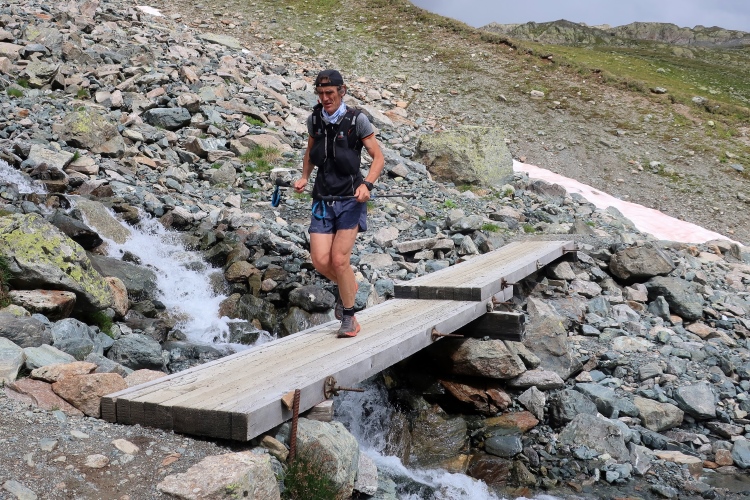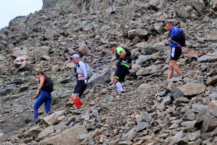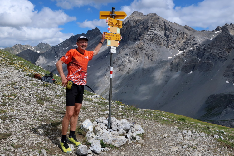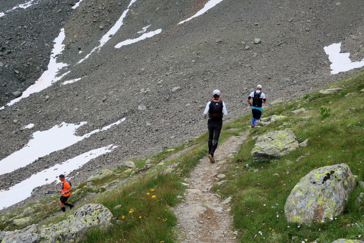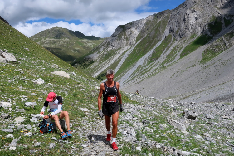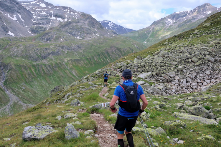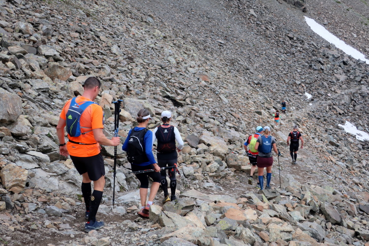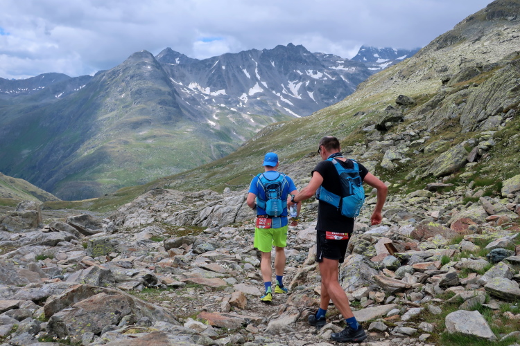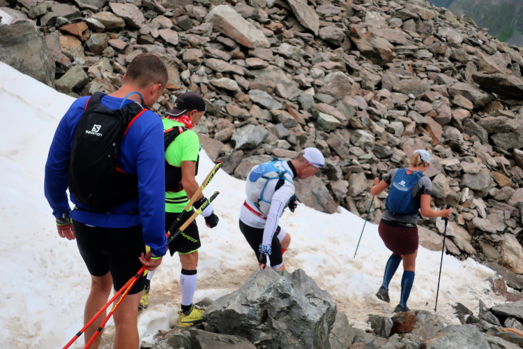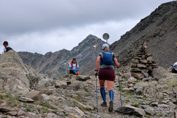 Ein Hubschrauber zieht laut knatternd seine Kreise. Ich denke, die winzigen bunten Läufergestalten in der weiten Bergwelt geben von da oben ein nettes Bild ab. Wobei das auch aus meiner Perspektive einen nachhaltigen Eindruck hinterlässt. Allmählich weicht dem Fels auch das letzte Grün. Durch blankes Geröll windet sich der Pfad schließlich unerbittlich dem höchsten Streckenpunkt entgegen. Ein Steinhaufen markiert diese Stelle auf 2.739 m üNN und zaubert bei fast jedem, der ihn erreicht, ein Lächeln ins Gesicht. Ohne ein Gipfelselfie zieht fast niemand von dannen.